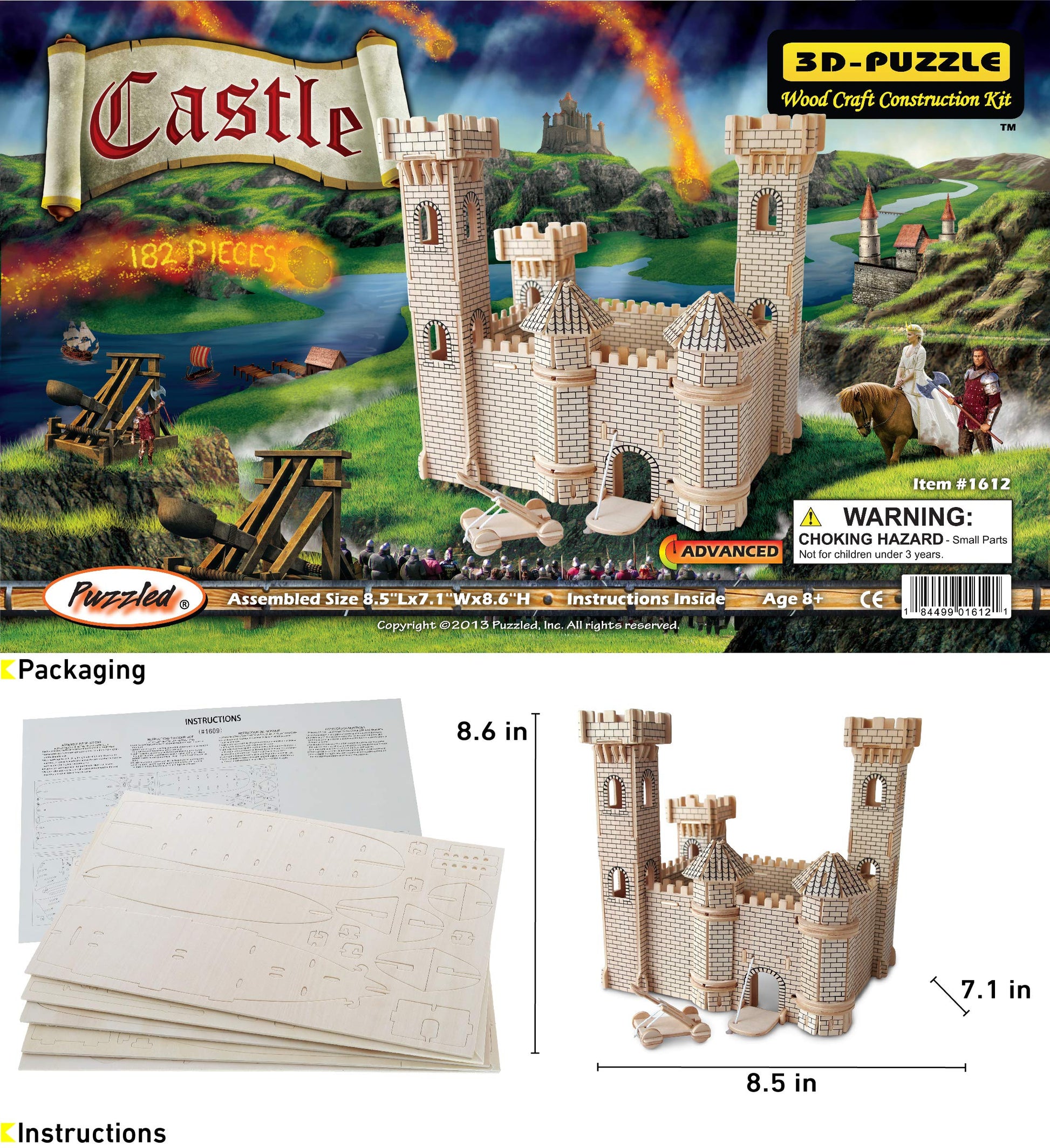 Challenge yourself & loved ones to build DIY 3-D puzzles & display your achievement as artwork or play with your new model toy. The Castle puzzle can be customized to make it fit any theme. 3D puzzles help develop a child's skills such as problem-solving, shape recognition & patience. Playing with puzzles encourages kids to become creative and productive. Once assembled, your little one can play with the Castle set as their new toy. Perfect indoor brain teaser games for children & a fun challenge for adults who love DIY projects and crafting. Building the Castle model figure makes a fun educational bonding activity for parents & their little ones. Hobbyists & collectors will be so excited to take on a new challenge & assemble the puzzle as fast as they can! Ideal for kids who love solving different kinds of puzzles. Suitable for kids age 8 & up. Includes 1 Puzzled Castle 3D Puzzle Wood Craft Construction Kit with 182 interlocking puzzle pieces. The Castle set figure features authentic intricate details such as the characteristic barbican, footbridge, and tower that result in a realistic-looking model kit. Everything is pre-cut and assembled by pushing the pieces together. There is nothing to cut or glue! All pieces are interlocking & will remain sturdy once the puzzle is perfectly assembled. Puzzle kit comes with an instruction manual. The Castle 3D puzzle is made from premium quality wood & durable materials. All puzzle pieces are laser cut and sanded thoroughly to ensure smoothness of edges. The 3D Puzzles are even paintable if desired. Colored with a natural wood COLOR which can be painted for a more personalized look. When fully assembled, the Castle DIY model stands upright, ready for display and to exhibit. Puzzled's 3D Wooden Puzzle will surely bring a smile to your loved ones as they recall the memories they had while building the unique Castle educational toy. When fully assembled, the Castle 3D puzzle measures 8.5'Lx7.1'Wx8.6'H. Paint & glue not included.