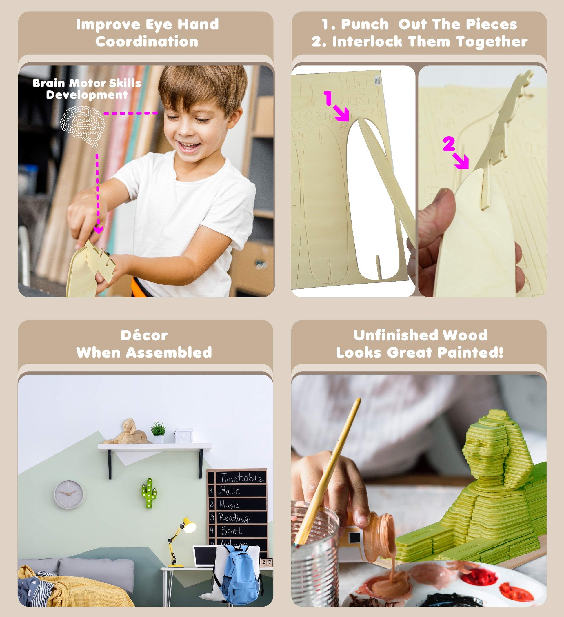 THE SPHINX SET COMES WITH UNIQUE DESIGN YOU WILL LOVE - Be proud to display your assembled Sphinx set model & share the love for historic landmarks, model building and puzzles with your friends & family. This instructive miniature Sphinx kit will surely bring a smile to any kid with a passion for egyptian history and memorabilia, wooden puzzles & building kits. Our Famous Sites collection is ideal to get children started with model building & developing motor their skills in a fun way. | THE SPHINX SET DIY 3D PUZZLE IS FOR ANYONE WHO LOVES PUZZLES - The Sphinx 3 dimensional craft kit is a model to build for kids & adults who love using their brain & create something with their hands. Puzzles lovers at any age or gender will enjoy building this amazing 161 pieces wood toy kit and paint the 3d wood puzzle to make it their own. It is a great father and son 3d puzzles for boys school project as well as puzzle for girls get together and craft play time with their friends and family. | INCLUDED WITH THE PURCHASE OF 3D SPHINX WOOD PUZZLE KIT - Includes 1 Sphinx 3D Puzzle Wood Craft Construction Kit with 161 interlocking puzzle pieces, an instruction manual & 1 paper for sanding edges. 3D Puzzles never looked so good and the unfinished natural wood can be painted or colored for a more personalized look. In most parts no glue is needed & the pieces interlock together. The wooden puzzle approximate assembly size is 9''L x 4''W x 4.75''H. Paint and glue are not included in kit. | HIGH-QUALITY SPHINX WOODEN PUZZLE 3D KIT - The miniature Sphinx 3D puzzle is made of high-grade 3mm natural wood. All puzzle pieces are laser cut and sanded thoroughly to ensure smoothness of edges. Adorned with realistic details like its characteristic body, head, and long arms, that result in an authentic-looking model kit. All surfaces can be customized making it an ideal hobby paint DIY wood toy project. Once fully assembled, the Sphinx kit model stands on its own ready to exhibit & display. | IDEAL USE FOR THE SPHINX WOOD KIT 3D MODEL PUZZLE - Challenge yourself & your loved ones to build this DIY cut 3D puzzle, display your achievement as artwork or play with your new model toy. 3D puzzles woodcraft construction kits help develop skills like eye coordination, problem-solving & shape recognition, while encouraging creativity. Customize your egyptian Sphinx diy model! Paint it for school projects or make it a game for friends & family to enjoy while spending quality time together.