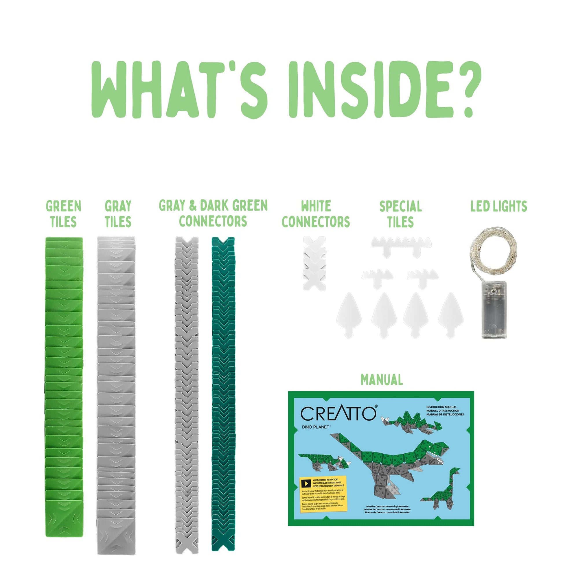 With 190 Creatto pieces and a string of 40 LED lights, you can build four awesome, illuminated dinosaur models: Tyrannosaurus rex, Triceratops, Stegosaurus, and Brachiosaurus. Battery-powered lights require 2 AA batteries (not included). Suitable for ages 8 and up.