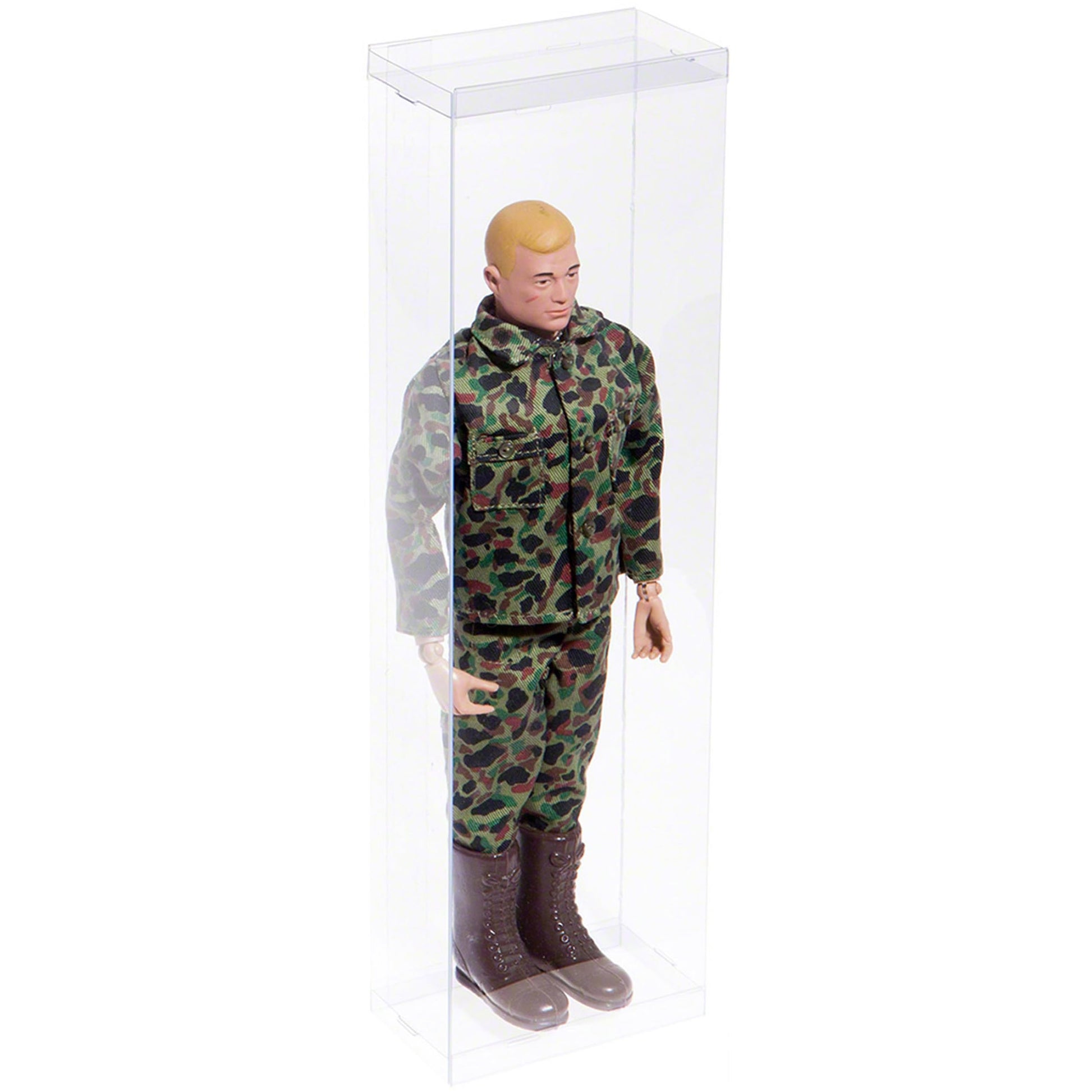 DollSafe Clear Folding Display Box for 11-12.5 inch Dolls and Action Figures, 4'' W x 2.25'' D x 13'' H, Pack of 2Size: 4 x 2.25 x 13 inches (width x depth x height)What size box to order? Measure your item by its width, height, and depth because the box needs to fit all the way around.Material: Made from a thick, clear plastic that is flexible yet sturdy.Uses: This DollSafe display box is a safe and secure way to store or display your fashion dolls, porcelain dolls, and action figures that are 11-12.5 inches tall and 4 inches wide.Does Not Include: Pictured action figure.