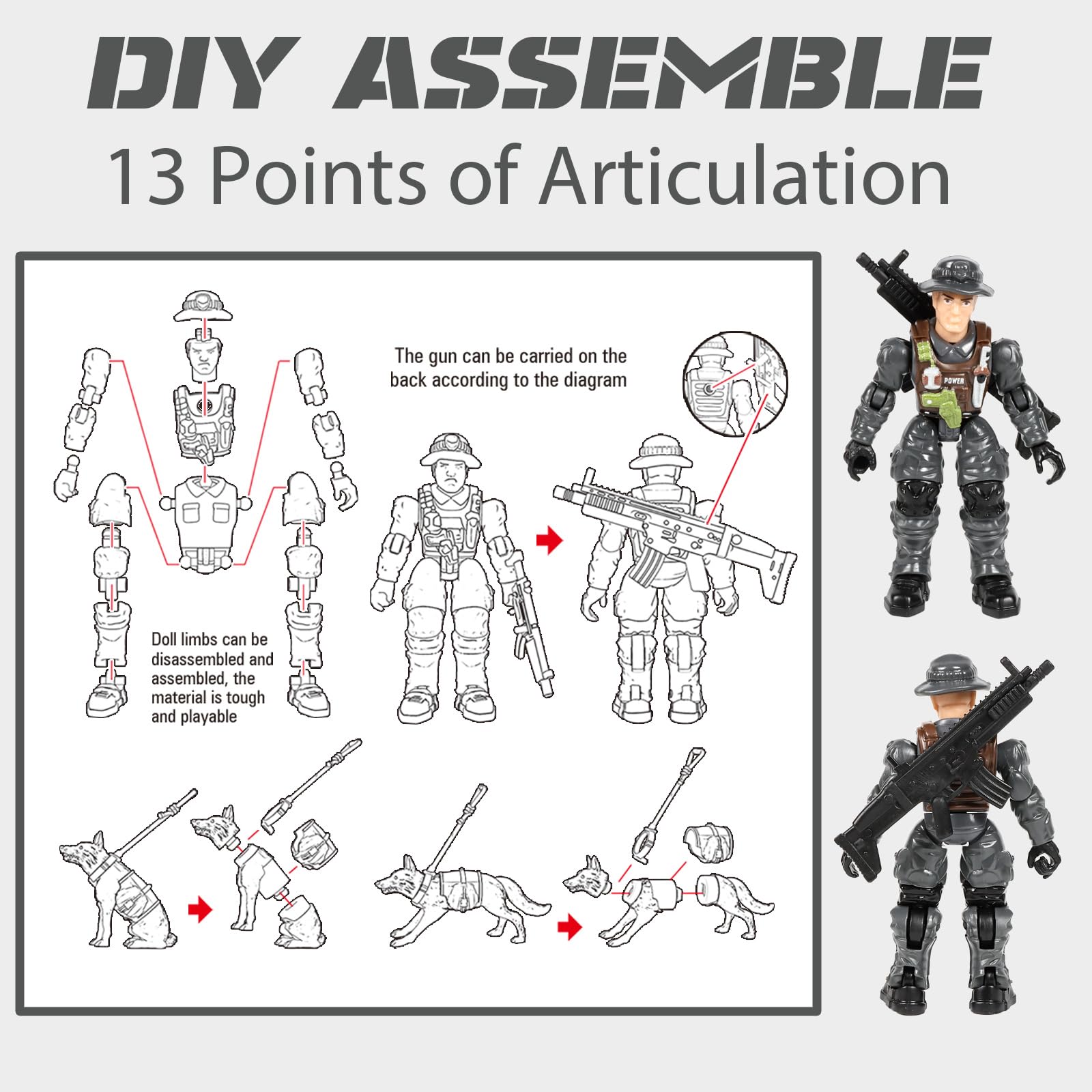 Action Figures: This army men set includes 1 dog (style randomly) and 6 soldiers with . You will receive pre-assembled action figures allowing kids to immediately set up an army for battles and accomplish rescue missions. Let their imagination run wild to create scenes and enjoy hours of fun playing. | Unique Design: The height of the soldier is 3.8 inches. The heads hats helmets arms legs and shoes of all the soldiers are detachable and easy to assemble. This allows children to improve their hands-on skills while gaining a sense of accomplishment. Each action figure has 13 movable joints with elbows and knees that can bend enabling the creation of a variety of poses. Kids will surely be obsessed by these military figures. | Emotional Resonance and Nostalgia: These toy soldiers represent classics enabling you to relive childhood joys and share an emotional connection across time. Buying toy soldiers isn't just for play it's about connecting past and present emotions. | Creativity and Imagination: Army men offer infinite creative possibilities encouraging kids to unleash their imaginations and create various battle scenarios fostering their creativity. | Great Birthday Gift: For mature-themeds these toys are also a way to reminisce and relax and can find fun in leisure life. It can be given as a birthday gift to friends history lover son nephew or grandson.