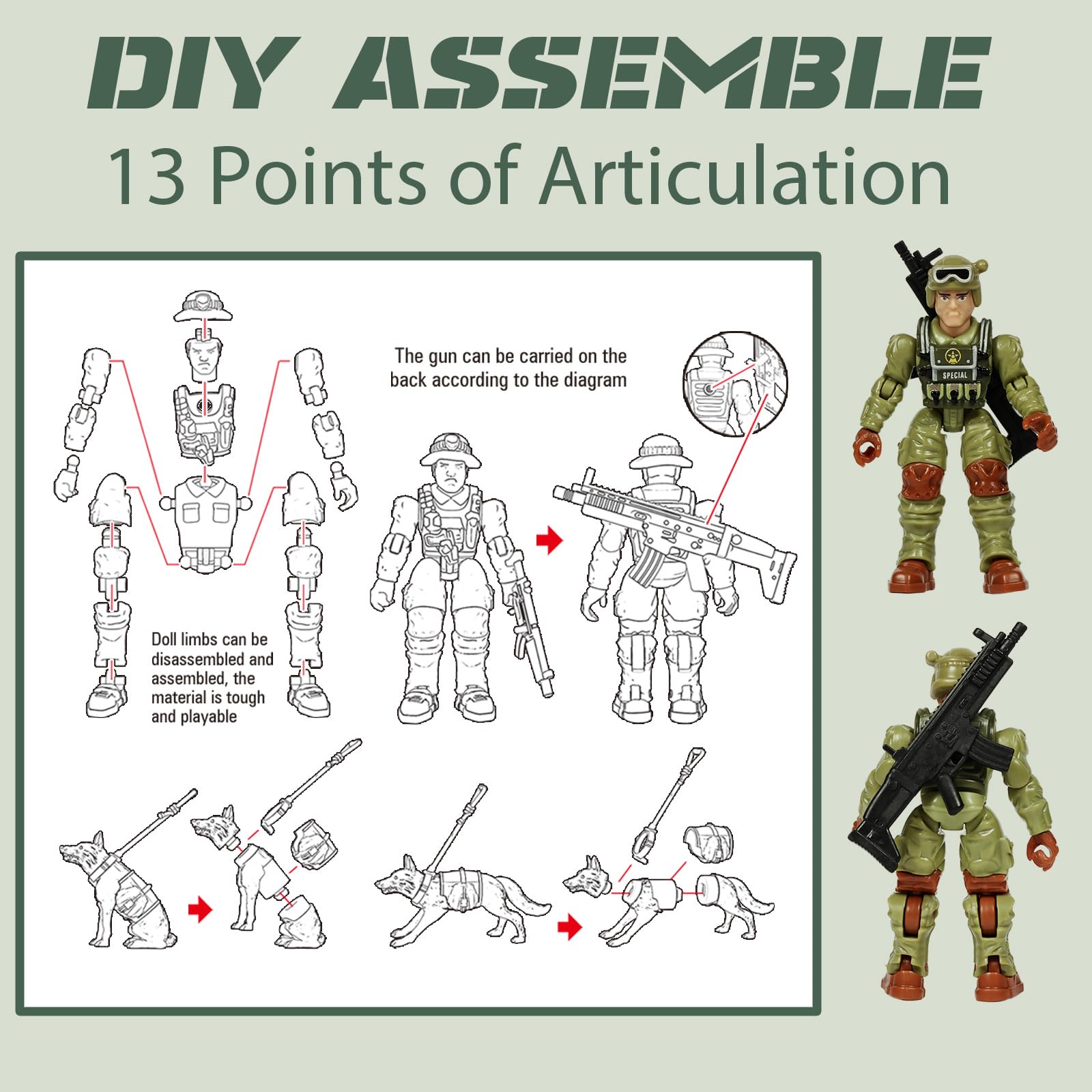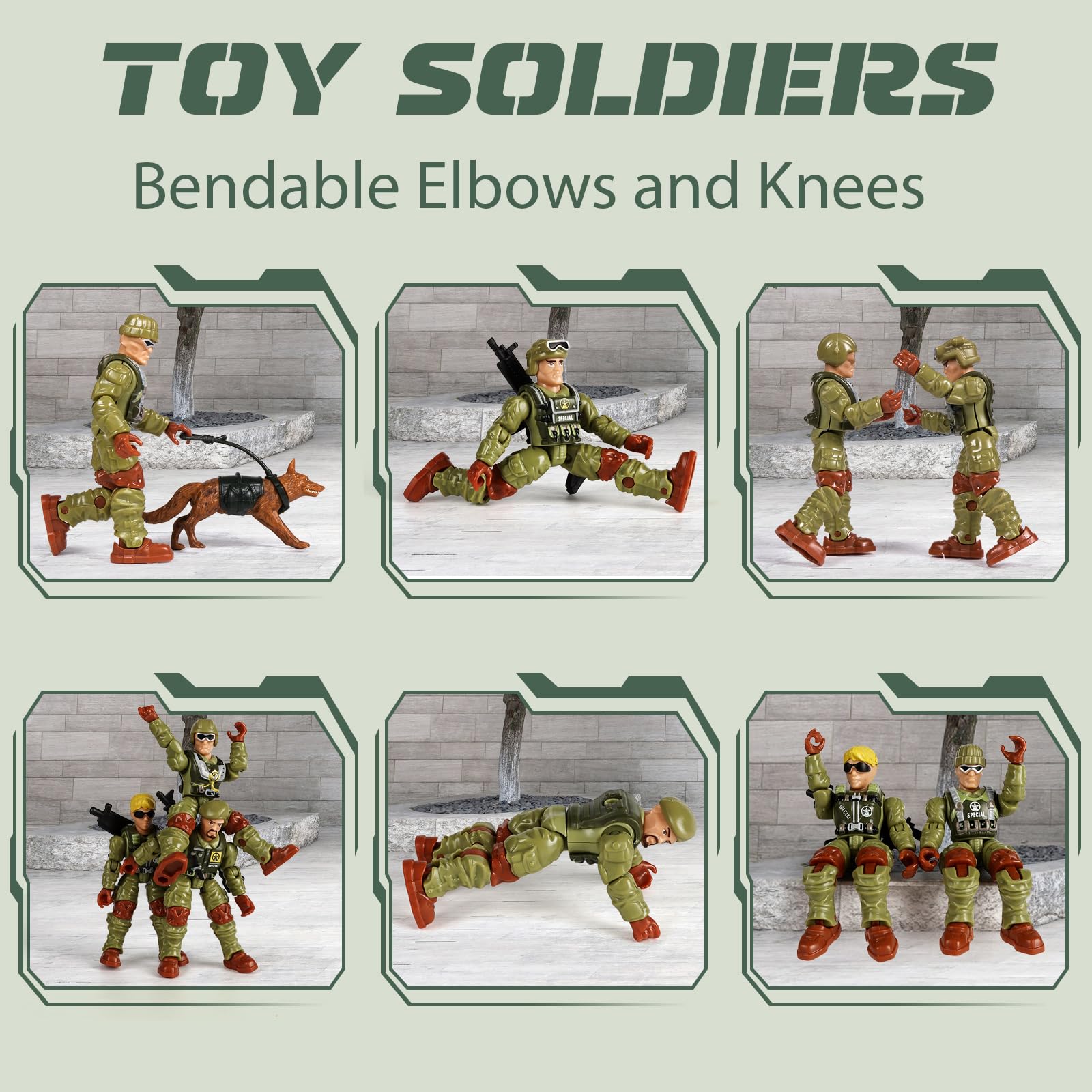 Action Figures: This army men set includes 1 dog (style randomly) and 6 soldiers with including a female. You will receive pre-assembled action figures allowing kids to immediately set up an army for battles and accomplish rescue missions. Let their imagination run wild to create scenes and enjoy hours of fun playing. | Unique Design: The height of the soldier is 3.8 inches. The heads hats helmets arms legs and shoes of all the soldiers are detachable and easy to assemble. This allows children to improve their hands-on skills while gaining a sense of accomplishment. Each action figure has 13 movable joints with elbows and knees that can bend enabling the creation of a variety of poses. Kids will surely be obsessed by these military figures. | Emotional Resonance and Nostalgia: These toy soldiers represent classics enabling you to relive childhood joys and share an emotional connection across time. Buying toy soldiers isn't just for play it's about connecting past and present emotions. | Creativity and Imagination: Army men offer infinite creative possibilities encouraging kids to unleash their imaginations and create various battle scenarios fostering their creativity. | Great Birthday Gift: For mature-themeds these toys are also a way to reminisce and relax and can find fun in leisure life. It can be given as a birthday gift to friends history lover son nephew or grandson.