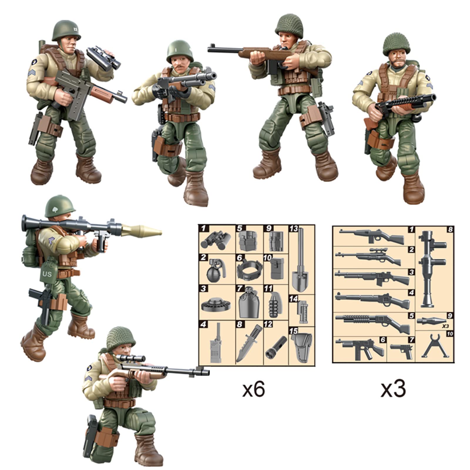 MEIEST 6 PCS Mini WWII Soldier Military Action Figures Army Model Building Block Toys with Multiple Military Accessories Party Favors Set for Kids (US Army)