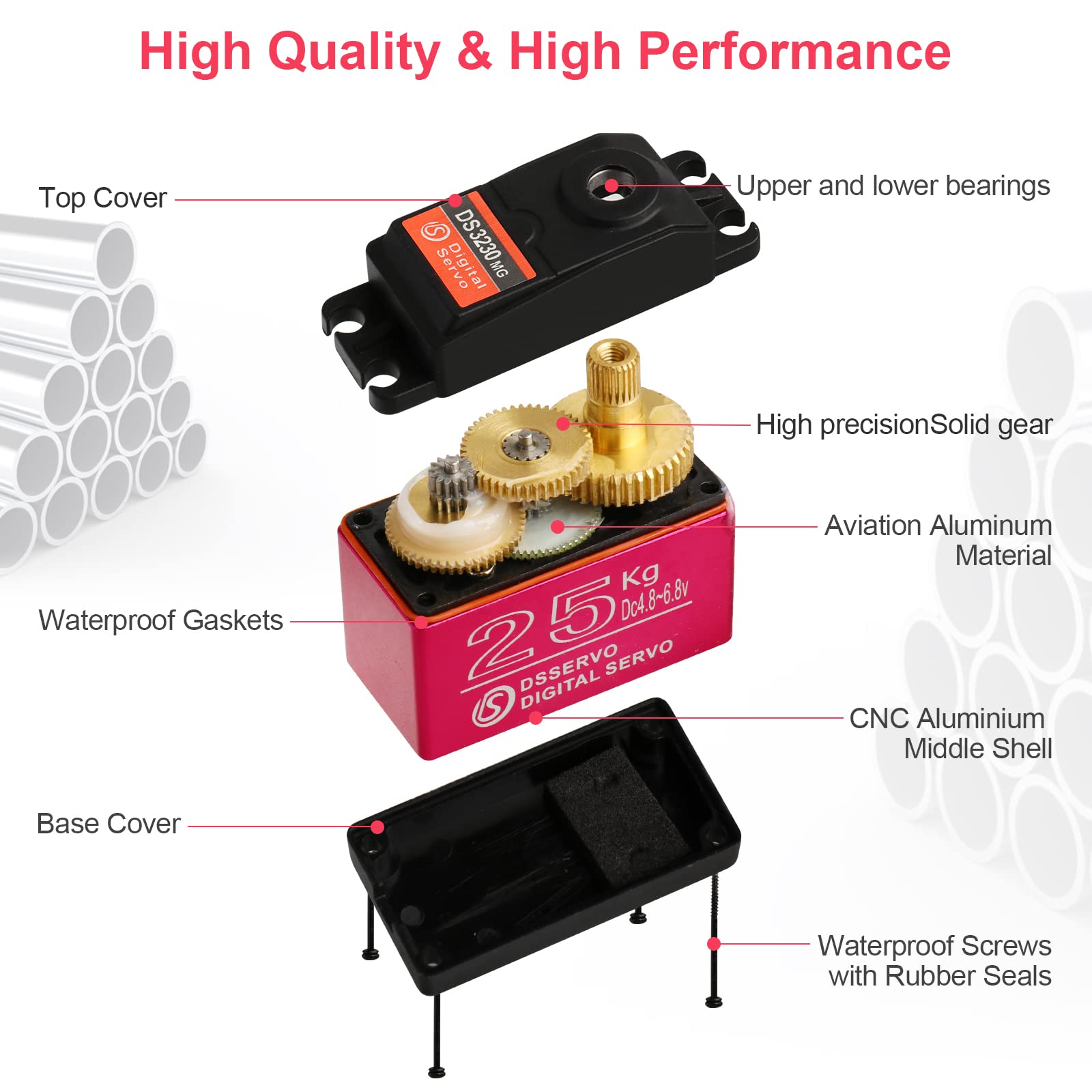 25Kg High Torque Rc Servo Digital Servo Full Metal Gear Waterproof With 2 25T Servo Horn Compatible With 1/6,1/8, 1/10, 1/12 Rc