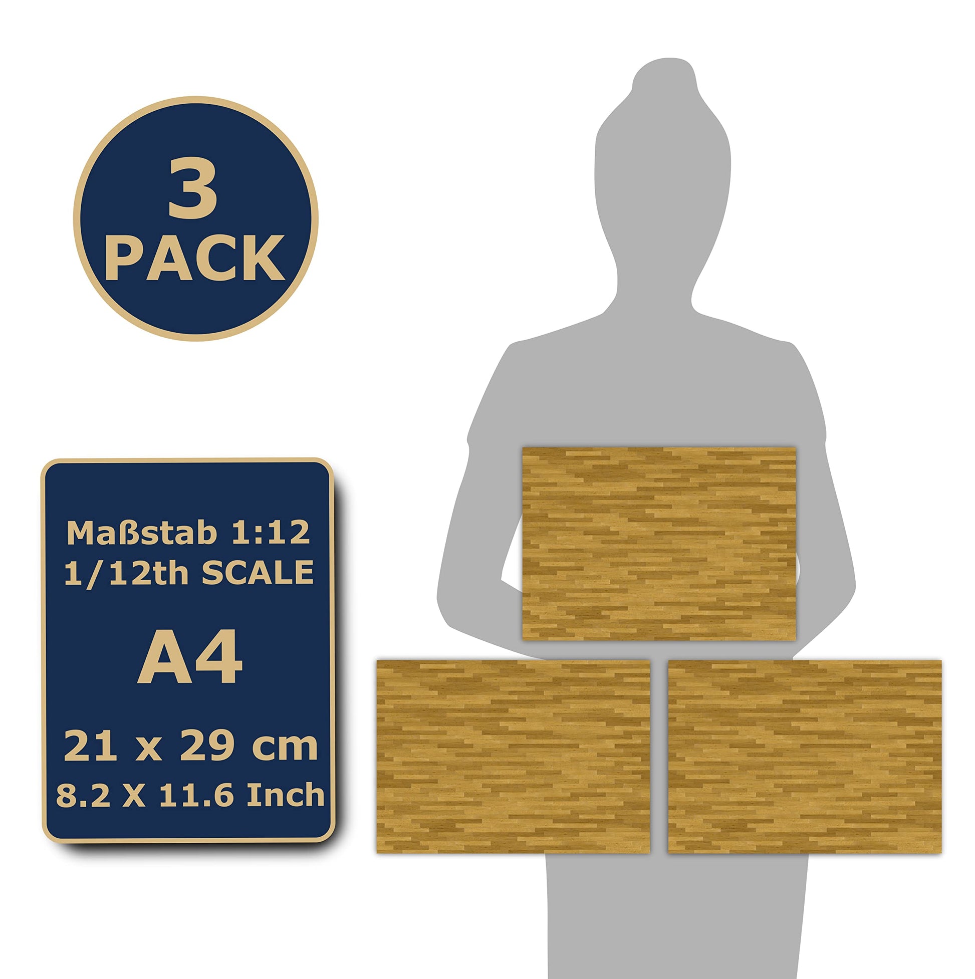 Large, high-resolution floor covering for dollhouses or toy houses in high print quality in 1:12 scale. The print is done on a sticker film so that the entire flooring can be glued and does not slip. With scissors, you can cut the stickers to any shape and customise them to your dollhouse. Perfect for customising your dollhouse and equipping with high quality accessories. Popular with hobbyists and children to implement DIY and custom projects. Align your model building dollhouse, dollhouse with floor coverings in the look of high-quality oak wood, tropical wood or walnut wood as a laminate or parquet. The product is compatible with homemade dollhouses or toy houses of various brands. Box contents: 3 sheets of self-adhesive toy floor covering in dimensions DIN A 4 (297 x 210 mm = 1/16 m) (8.2 x 11.6 inches). Browse our other items to match your order with other materials for your dollhouse.