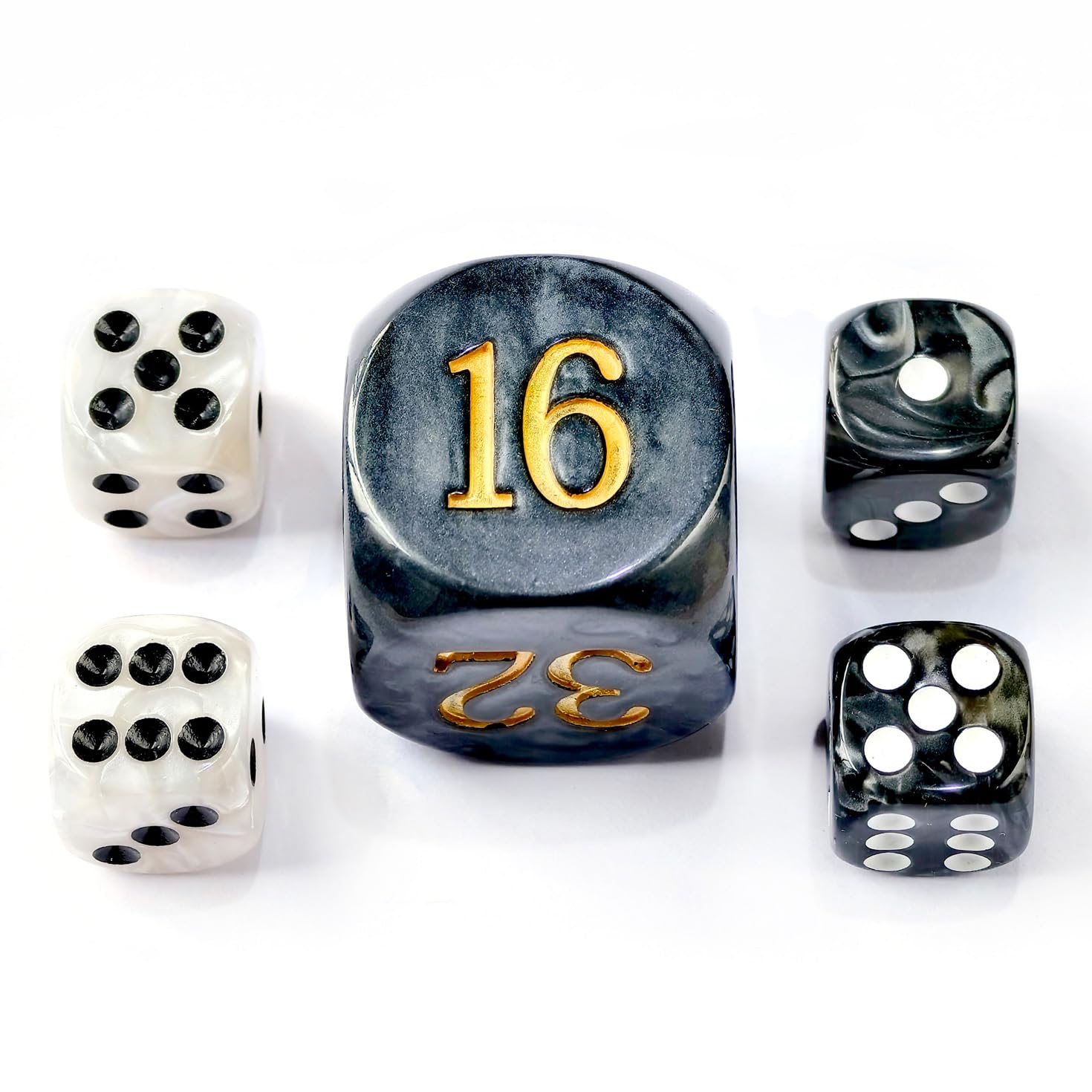 5Pcs Set 30Mm Backgammon Pearl Dice Set - 30Mm (1 3/16'') Large Backgammon Doubling Cube Plus 4Pcs 16Mm Dice (Black/White Marble