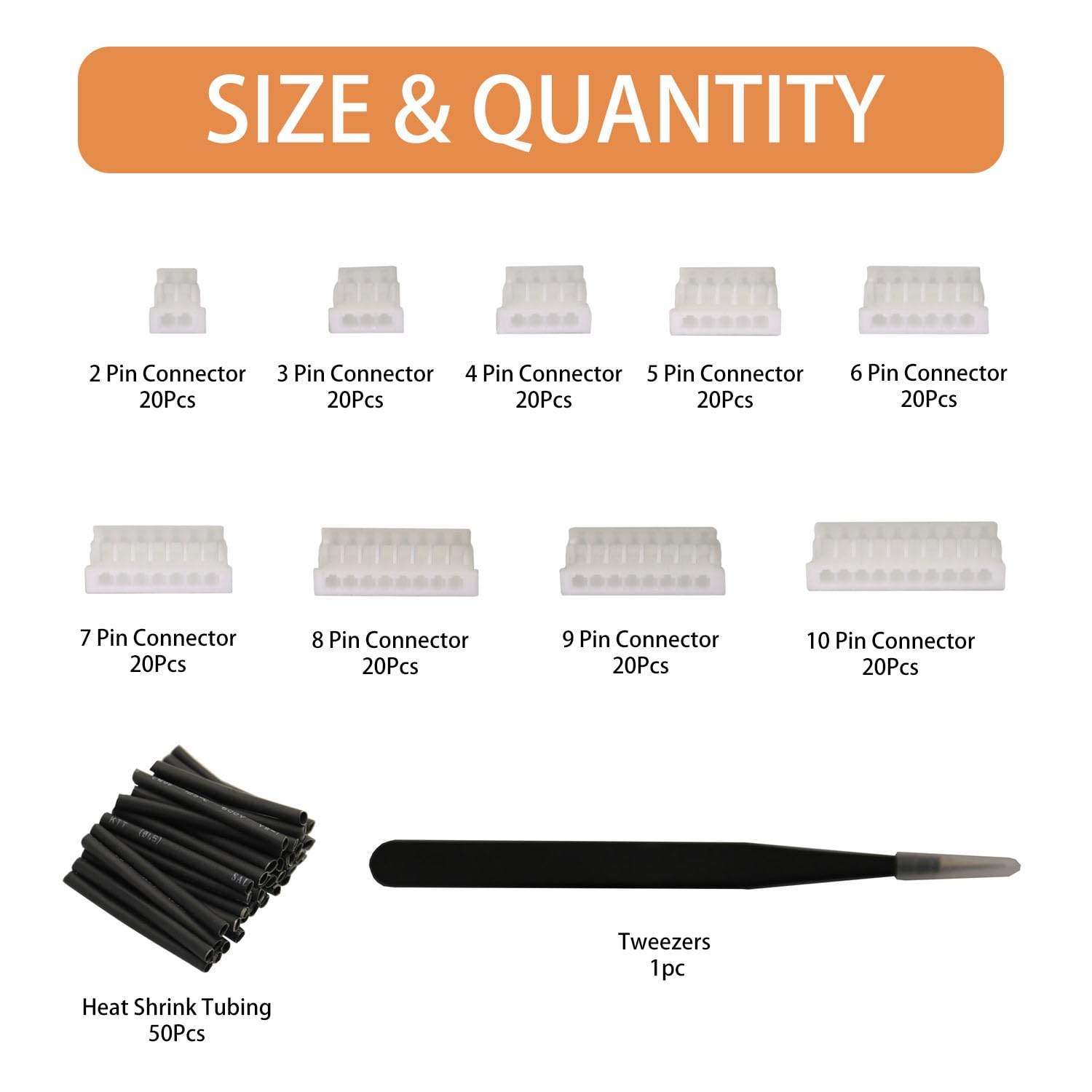 Package Included MX1.25mm 2pin : 20pcs MX1.25mm 3pin : 20pcs MX1.25mm 4pin : 20pcs MX1.25mm 5pin : 20pcs MX1.25mm 6pin : 20pcs MX1.25mm 7pin : 20pcs MX1.25mm 8pin : 20pcs MX1.25mm 9pin : 20pcs MX1.25mm 10pin : 20pcs Pre-crimped wire: 200pcs (10 colors, each 20pcs) Heat shrinkable tube: 50pcs Tweezers: 1pc