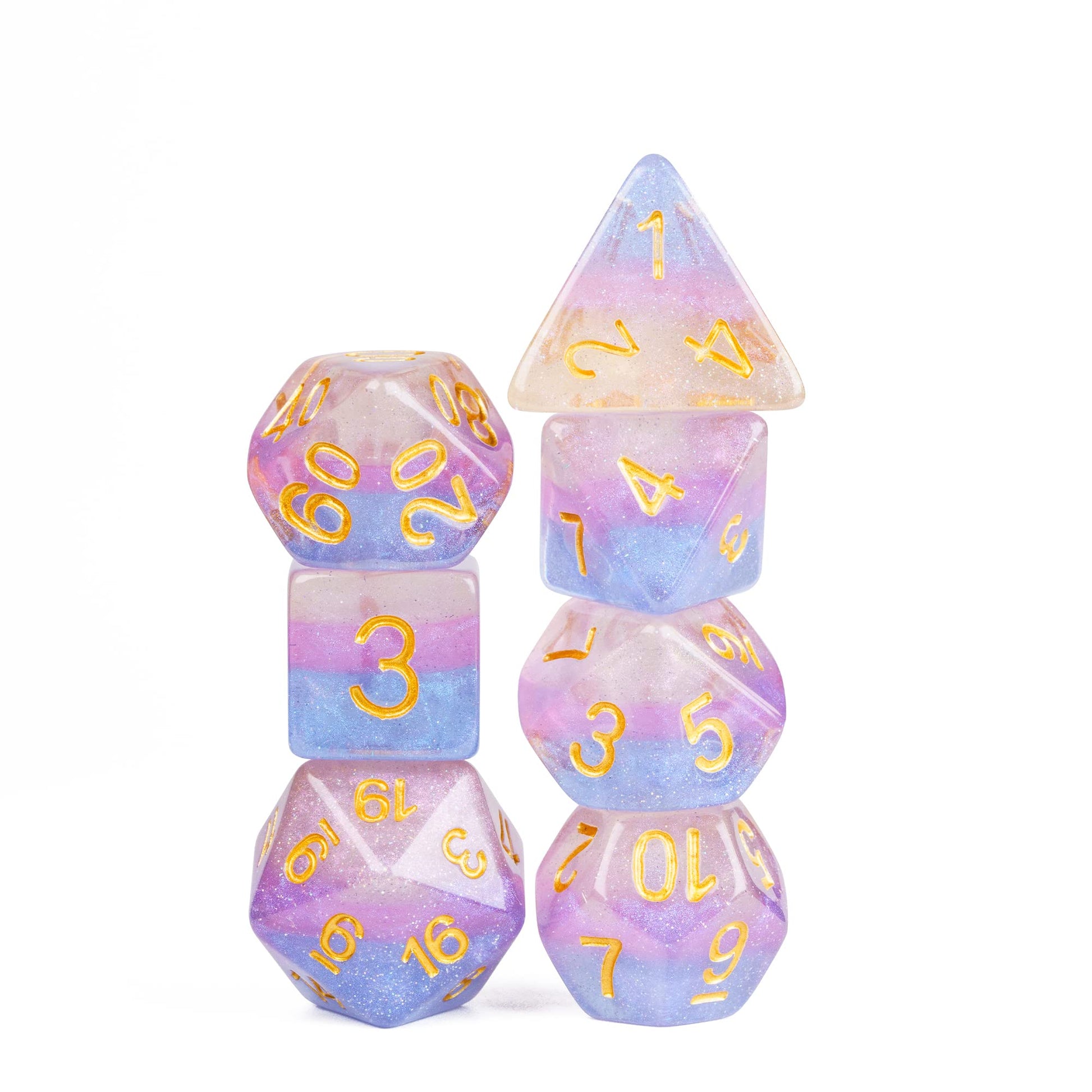 ?Dreamy Glitter Dice? : This dnd dice is filled with a lot of glitter to make the dice look sparkling and beautiful like a bright starry sky. The color combination of dice is also very beautiful. | ?Complete DND Dice Set? : Each dnd dice set contains 7 pcs dices, including 1*D4 dice, 1*D6 dice, 1*D8 dice, 1*D10 dice, 1*D00 dice, 1*D12 dice, 1*D20 dice. | ?Easy to Read? : The numbers in the DND dice stand out clearly against the background, so you can focus more on your games. Number 6's and 9's are clearly marked,no visual trouble. | ?Resin Dice?: These d&d dice set are made by resin material, healthy, environmentally, not easily deformed, natural and pollution-free. | ?Risk-Free Purchase?: If you receive defective dnd dice or missing dice, please contact us for replacement. Any issue, just contact us. We are always ready to help you.