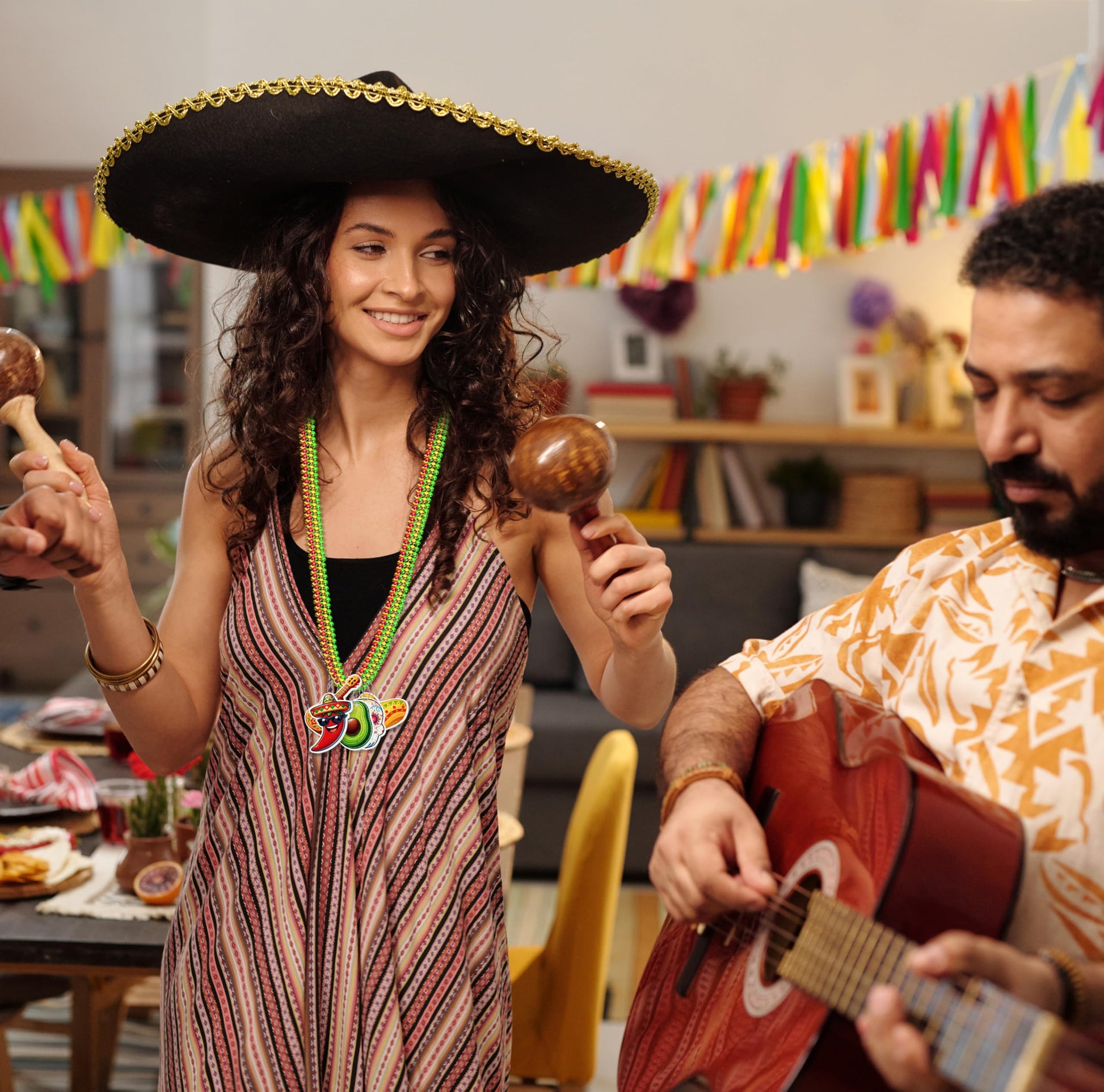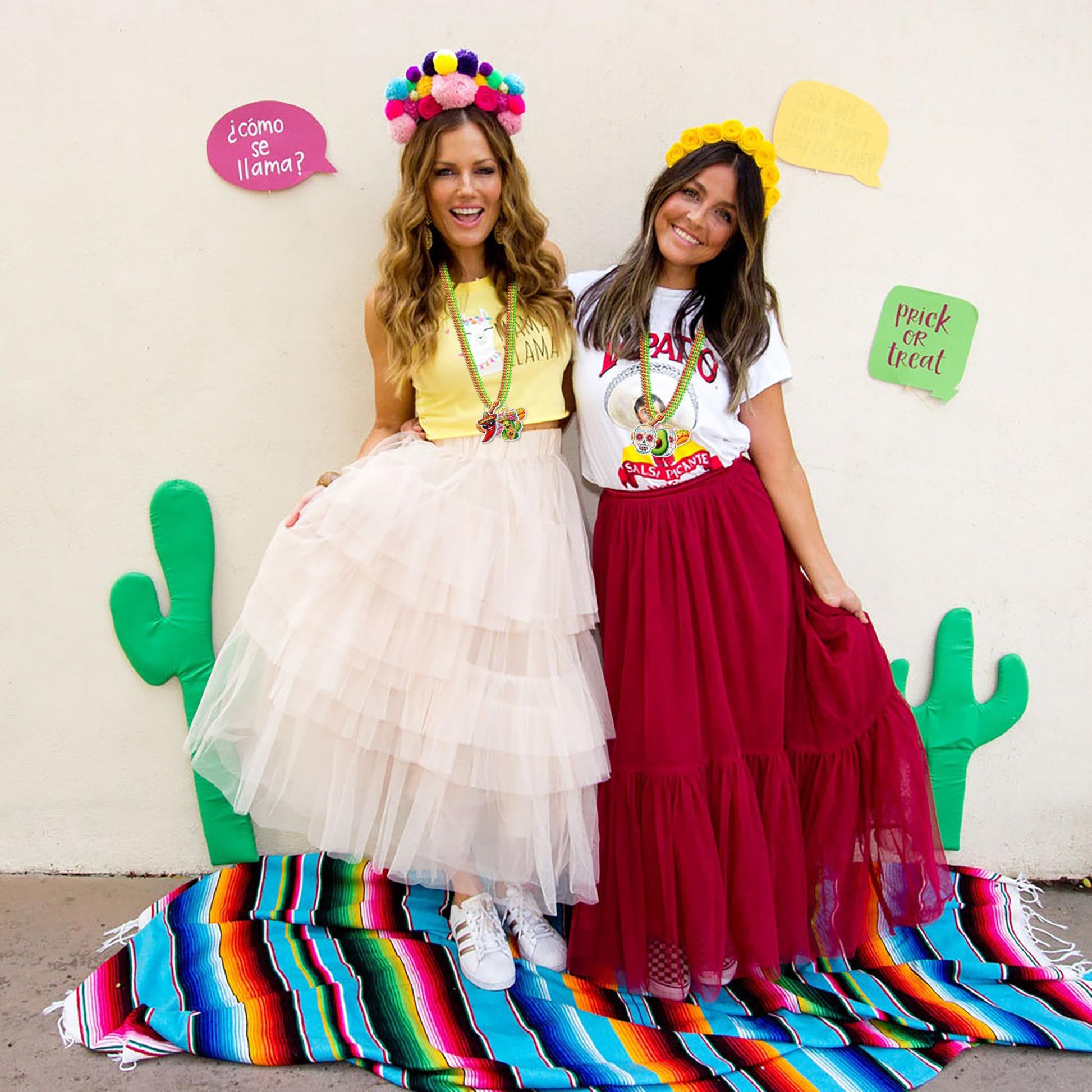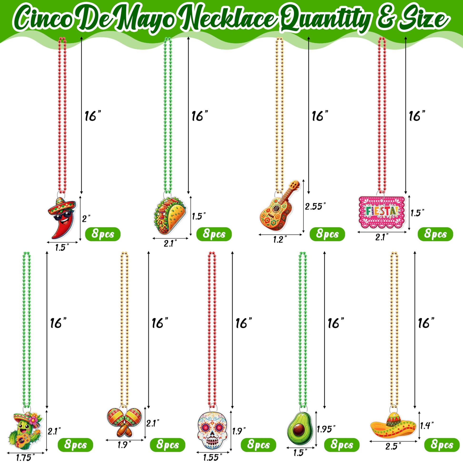 Package includes 36pcs cinco de mayo bead necklaces in 9 designs.Design features fiesta papel picado,taco,avocado,mask,cactus,hat,chill,maraca,guitar.