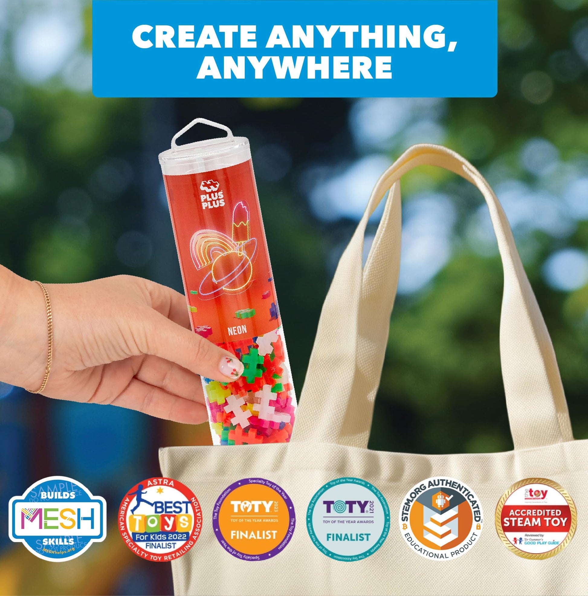 Plus-Plus is a whole new class of construction toy! One simple shape contains endless possibilities and hours of fun. Each piece easily connects to the next and lets your imagination create colorful flat mosaics or work in 3-D to make more intricate builds. Even curves are possible thanks to the unique design of this deceptively simple shape! A perfect STEM toy to develop fine motor skills, focus and patience - as well as design, imagination and creativity! All Plus-Plus sets are compatible with each other and this open play set adds more pieces and colors to the collection for more possibilities and fun. This tube contains 240+ neon pieces and an Idea Guide Booklet for building. BPA-free and phthalate-free. Designed and made in Denmark.