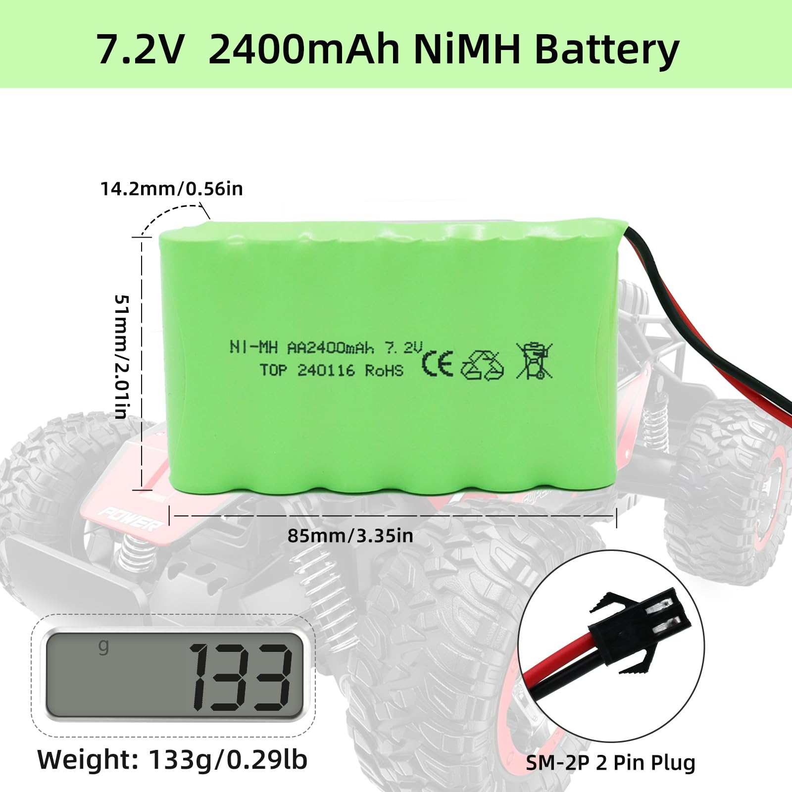 NiMH Lipo Battery SM 2P suitable for remote control high speed car toys,truck,tank,lighting - (1.Old version Huina Fisca Fistone Sgile 15 Channel 550 1550 560 1560 570 1570 and RaceTop TR-211 RC excavator construction truck; 2.AFUNX 1/12 remote control Car YIKESHU 1/16 RC truck) Package List You will get 1*7.2V 2400mAh Ni-MH lipo battery(6 AA NiMH battery pack), 1*USB 7.2volt charge cable