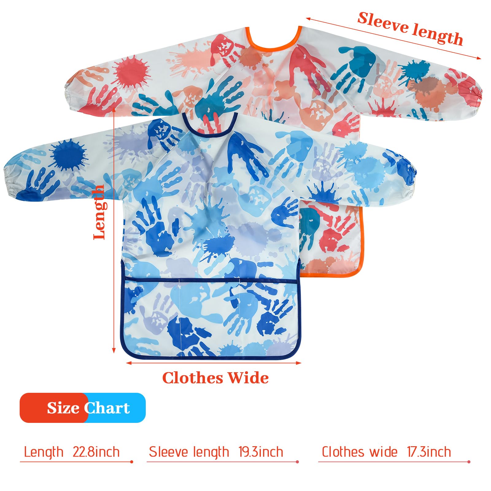 Specifications: Material: Polyester Color: Blue, pink Dimensions: Kids art smock measures 22.8 x 17.3 x 19.3 inches with three pockets What you will get: 1 blue and 1 pink handprint toddler smock Notes: Handmade, please allow slight size error Due to different screen displays, there may be slight differences in color