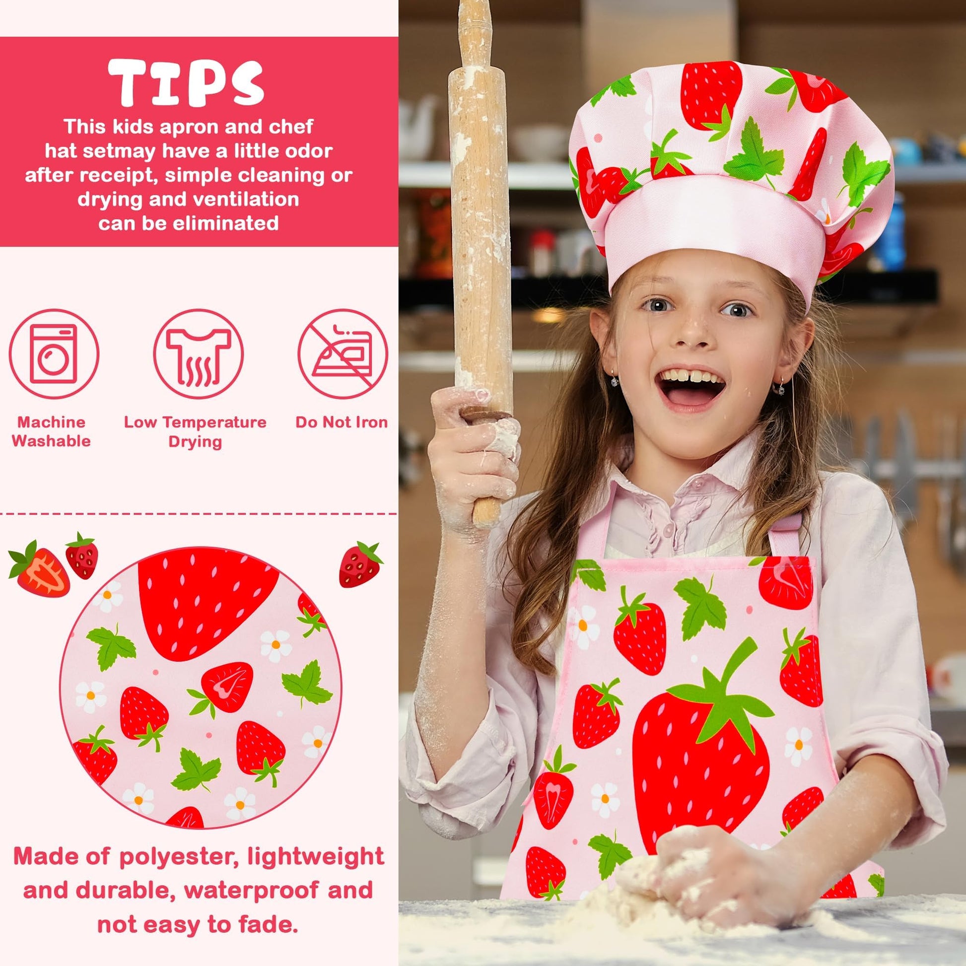 - Q: What colors are available for the apron and chef hat set? A: The set features a vibrant red color with adorable strawberry patterns. This design is appealing to both boys and girls who enjoy cooking.