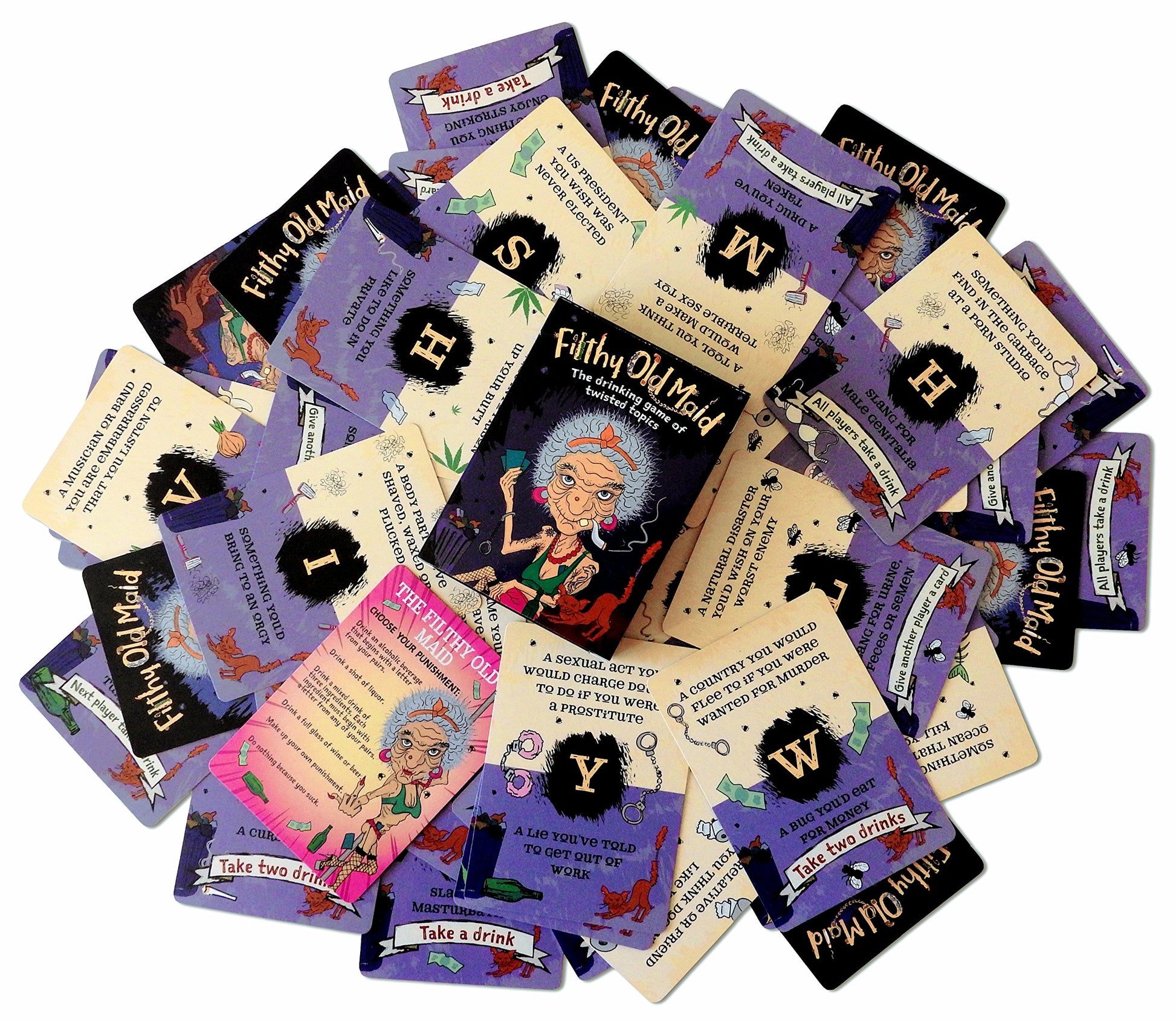 This is Old Maid gone bad. Players take turns responding to rude funny and absurd topics. Get stuck with the Filthy Old Maid though and you'll be punished! The player who has the Filthy Old Maid in their hand when the game ends is the loser and has to perform a punishment... usually involving drinking!