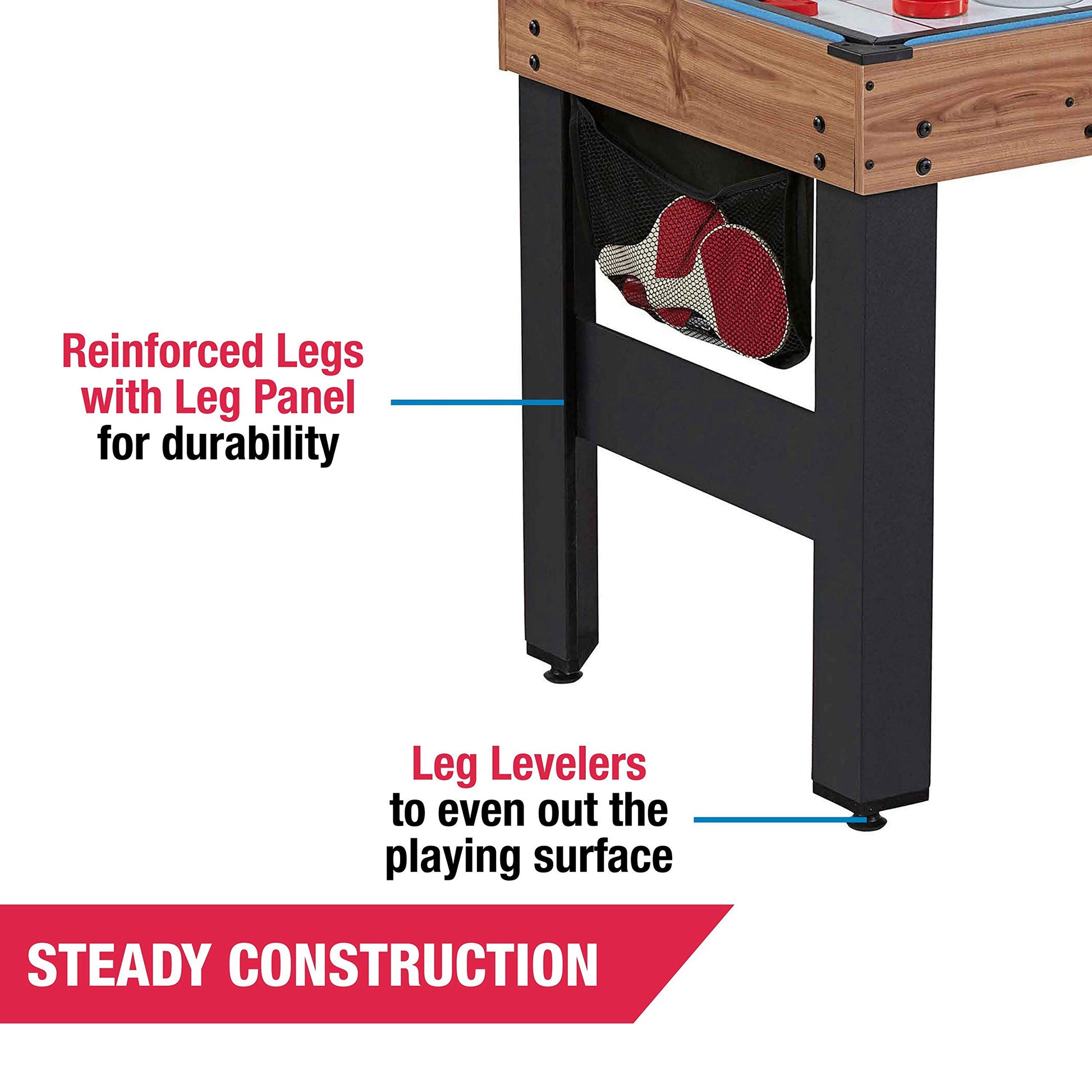 The MD Sports 48 inch five-in-one combo game table includes billiards, slide hockey, soccer, table tennis, basketball all in once compact footprint. The unique design features re-enforced legs for additional durability. Easily converts between games and all of the accessories needed to play are included. MD Sports 48-inch five-in-one combo game table is the top selling item every year, don't miss out this year.