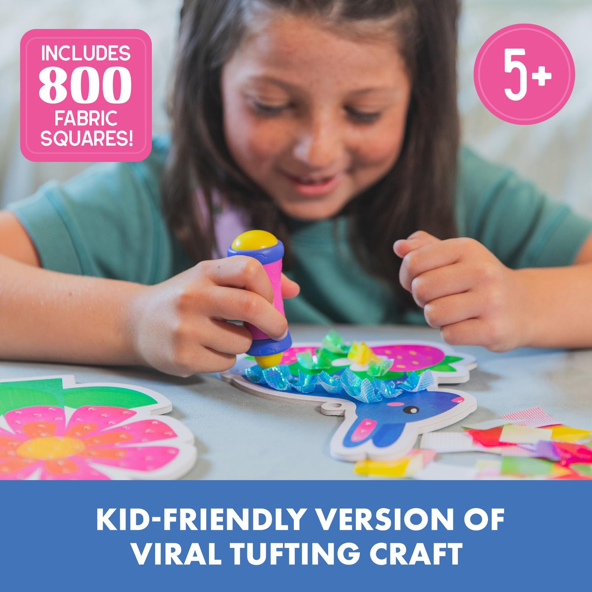 This set turns the viral tufting trend into a mess-free arts and crafts activity that develops fine motor skills, creativity, and imagination for kids ages 5 and up. Use the tool to punch fabric squares through each hole in the design card to create textured art! Includes kid-friendly tufting tool, 12 nature-themed garden magic design cards, and 800 tufting fabric pieces in six colors.