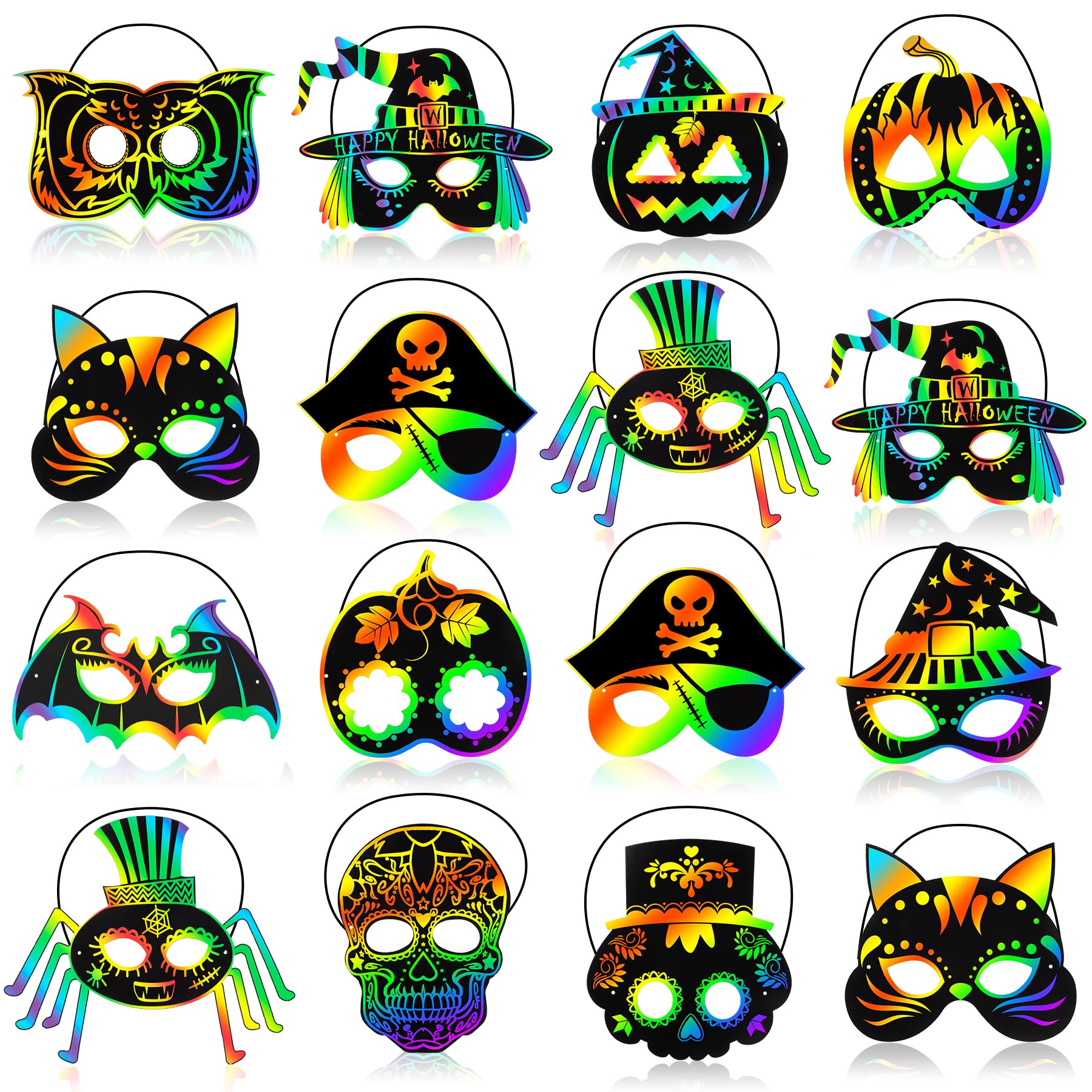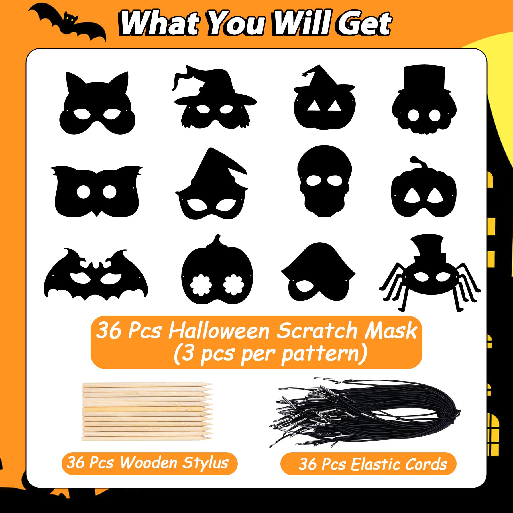 View compareGOMANCHE 36 Pieces Halloween Scratch Art Masks for Kids, DIY Rainbow Magic Scratch Paper Masks for Crafts, Bat Witch Pumpkin Spi