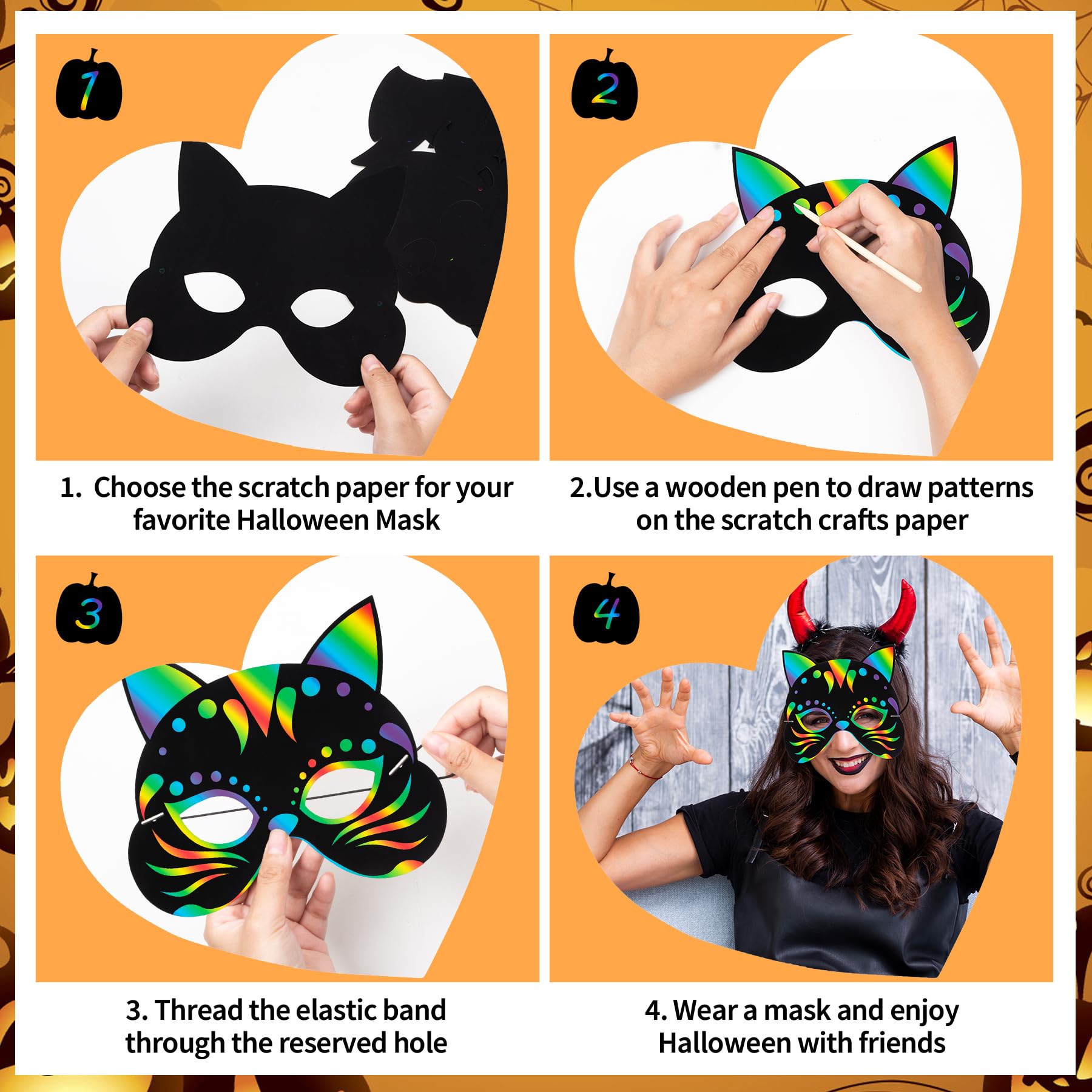 - Q: How do I use the scratch masks for Halloween crafts? A: To use the scratch masks, simply select your favorite design, use the provided wooden stick to gently scrape off the black coating, and reveal the vibrant rainbow colors underneath. Once finished, you can wear the mask using the elastic band.