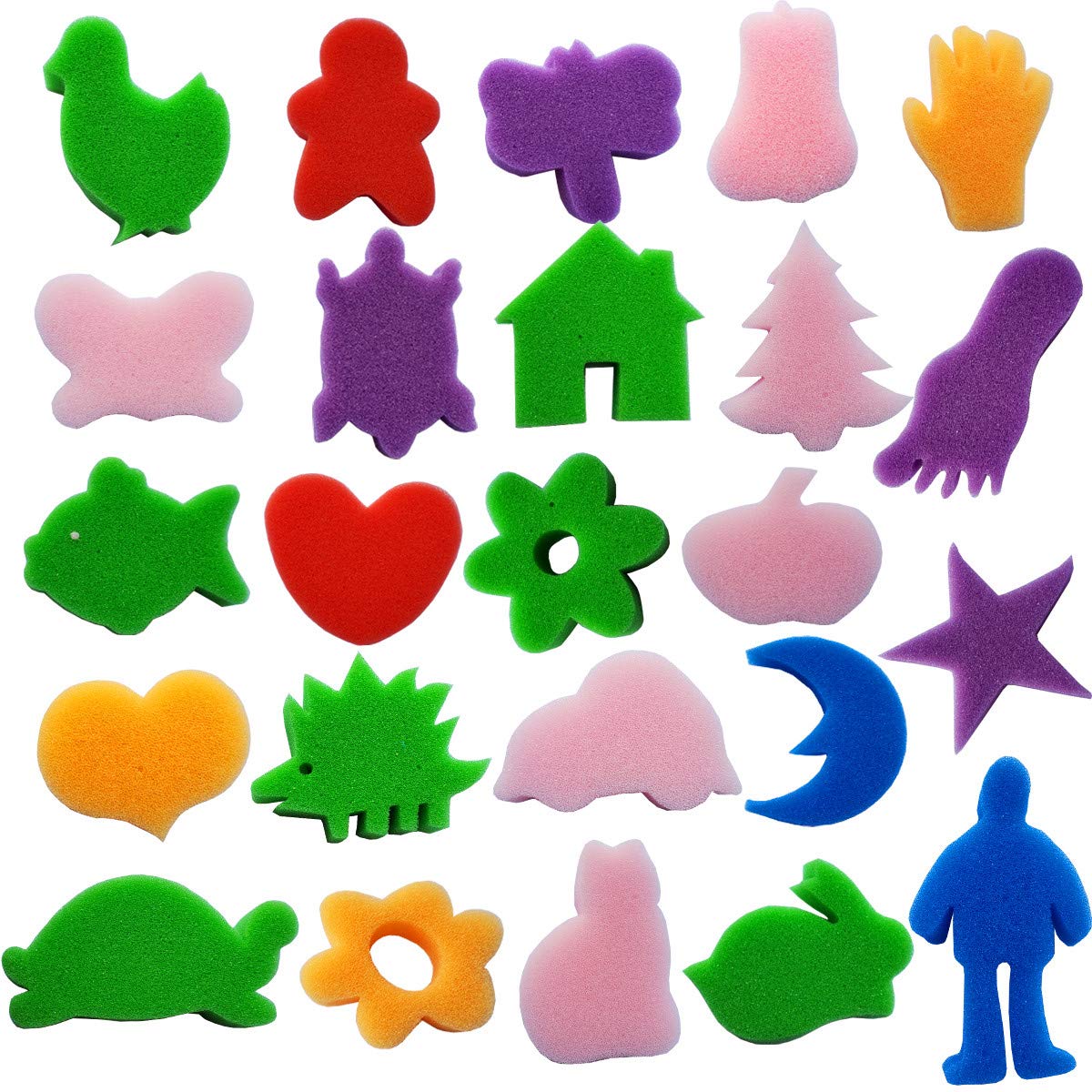 Material:Sponge,Foam,EVA,Nylon for brushes,ABS Plastic and wooden for handle Colors:Red,Blue,Purple,Green,Yellow and so on. Color migth be randomly,Please kindly understanding. Quantity:53 pieces Package includes: 24 x cartoon shape sponge 4 x wide rollers 6 x geometry stamp painting brushes 6 x oil painting brushes 4 x EVA brushes 4 x round sponges 5 x flower sponges WHY CHOOSE US:Our art sponge painting brushes are made of water-absorbing sponge, foam and EVA, non-toxic and safe, handles are made of wood or plastic,and perfect sizes for toddlers grasp A large quantity of brushes and sponges painting included ,thus to create colorful patterns and arts crafts as you want.