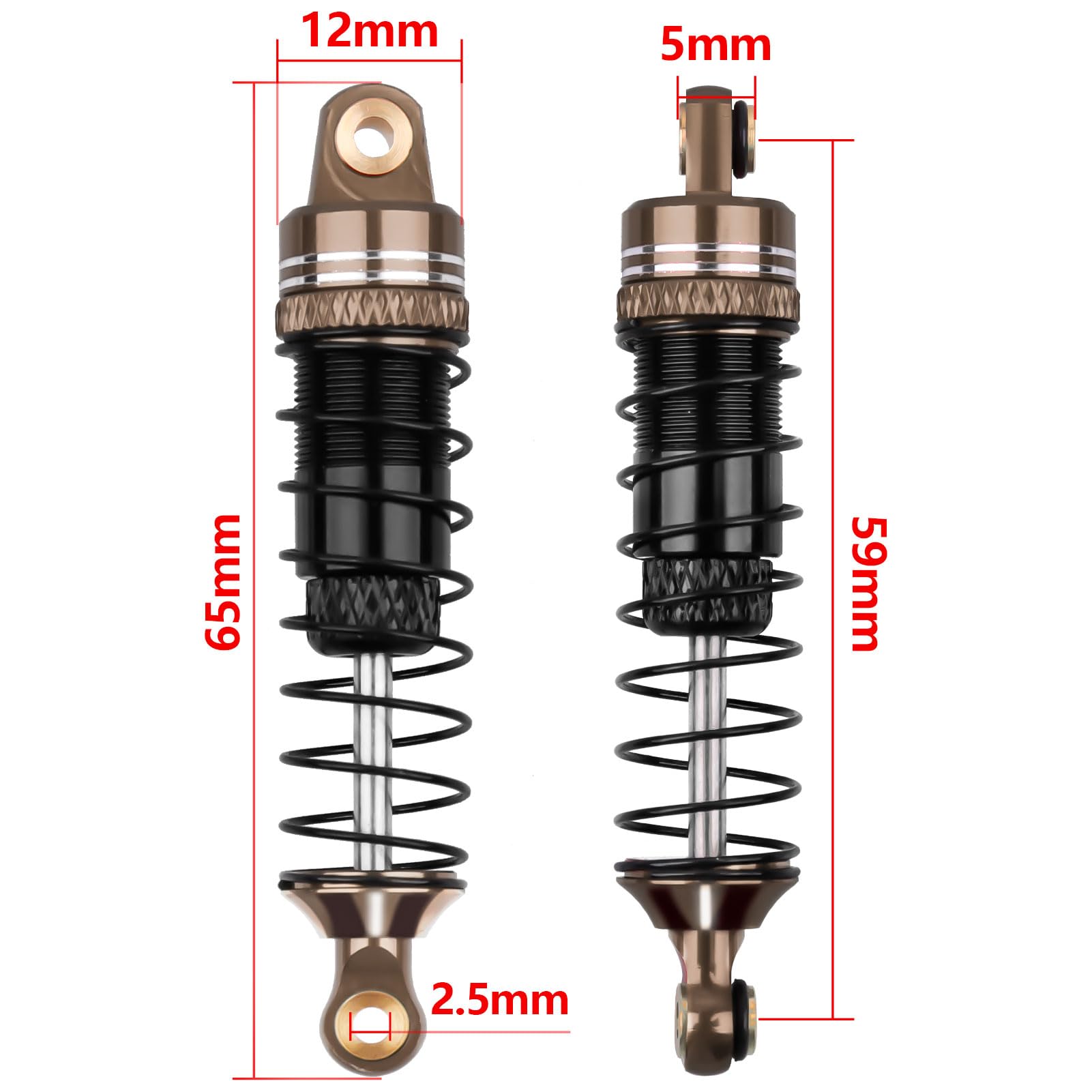 - Q: What are the dimensions of the HobbyPark Aluminum RC Shocks? A: The HobbyPark Aluminum RC Shocks have a length of 65mm and a 59mm eye-to-eye measurement, making them suitable for various RC crawler models.