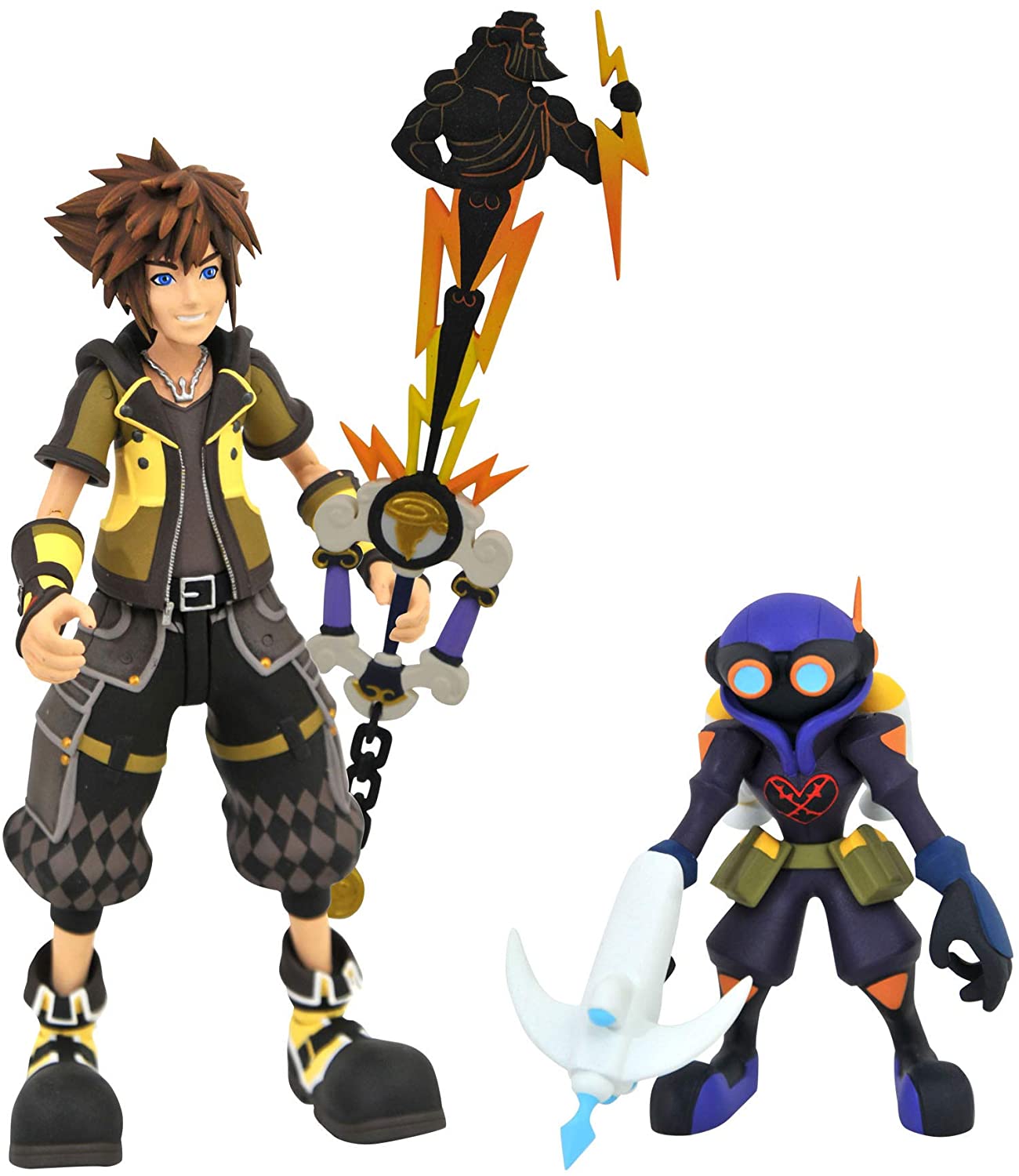 - Q: What characters are included in the Diamond Select Toys Kingdom Hearts 3 action figure pack? A: The Diamond Select Toys Kingdom Hearts 3 action figure pack includes Guardian Form Sora and an Air Soldier Heartless, along with the Hero's Origin Keyblade.