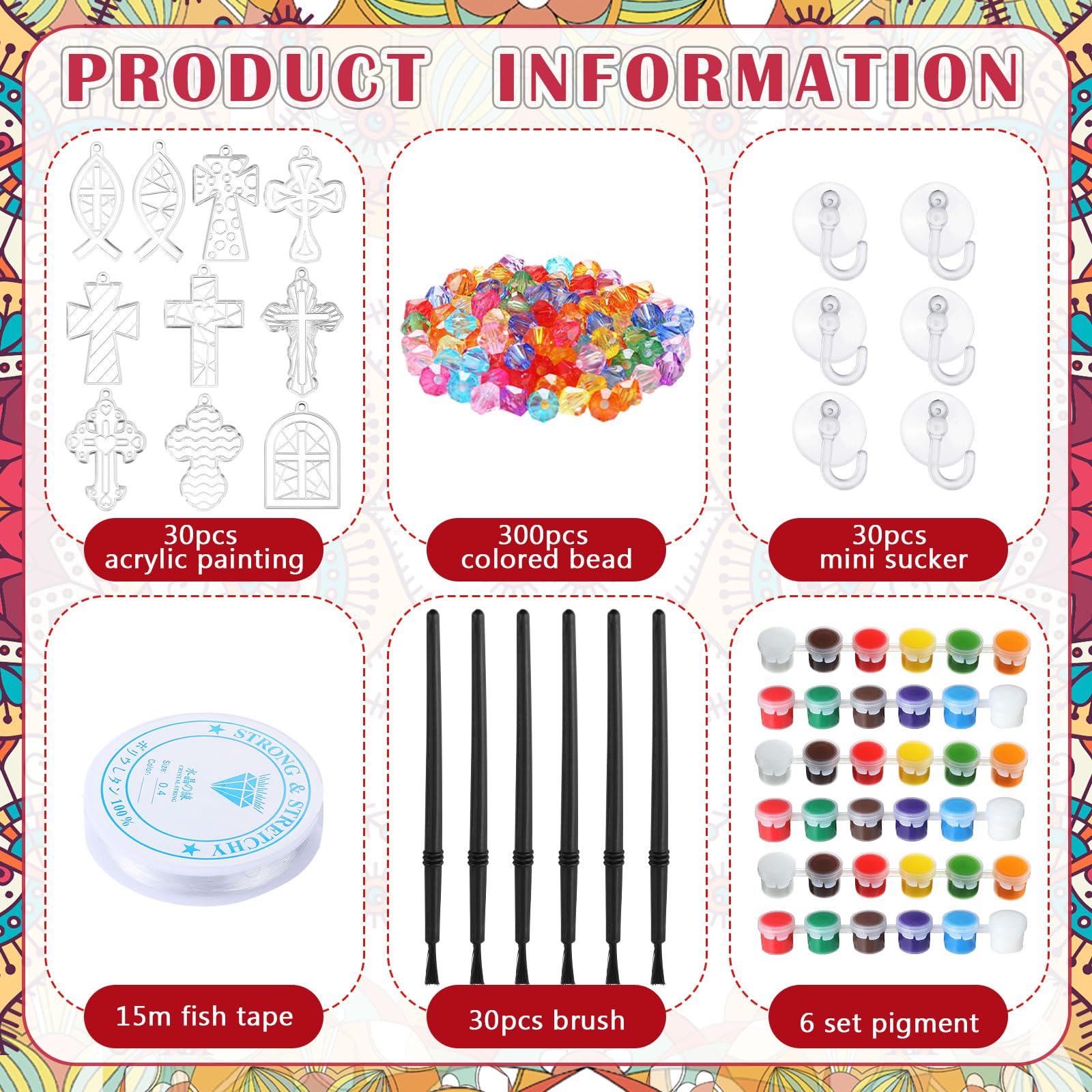 Features: Unleash your creativity with suncatchers window art kits, the comprehensive suncatcher craft kits provide hours of imaginative fun and artistic exploration. Its an ideal activity for rainy days, weekends, or any time they want to express their artistic talents DIY sun catchers ornaments are ideal for family, birthday parties and other occasions, not only a good choice for individual creation, but also an ideal project for group activities. Specifications: Material: acrylic Size: suncatcher about 3.5 inches in length Package includes: 30 x Sun catchers 300 x Acrylic beads, 30 x suction hooks 1 Roll 590.55 inches of fishing line 30 x Paintbrushes (with enough paint) Notes: Warm reminder, to handle dried paint, add a small amount of cold water to the pigment and mix it well before use Manual measurement, please allow slight errors on size. The color may exist a slight difference due to different screen displays. Winding risk may exist, please keep our the fishing line away from children.