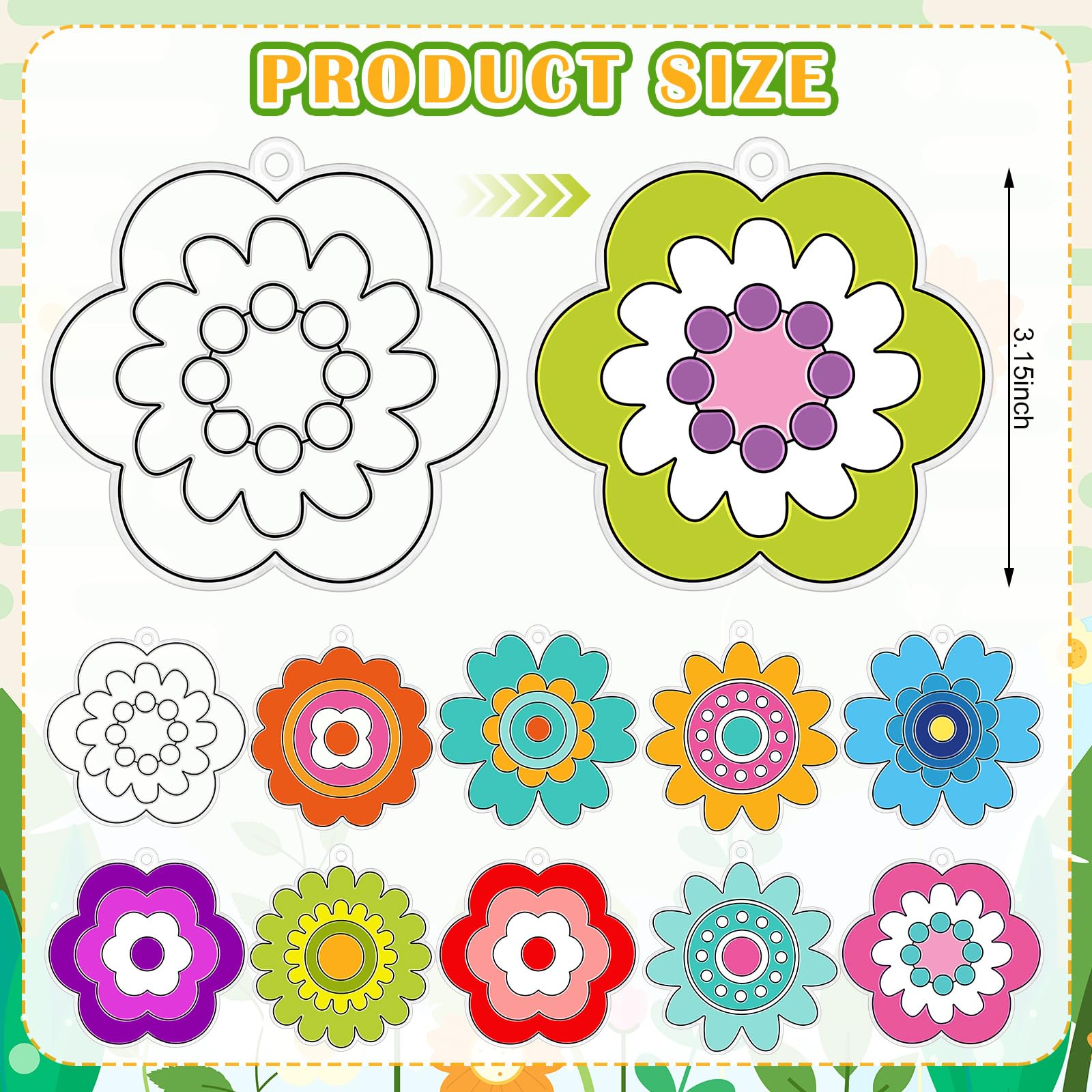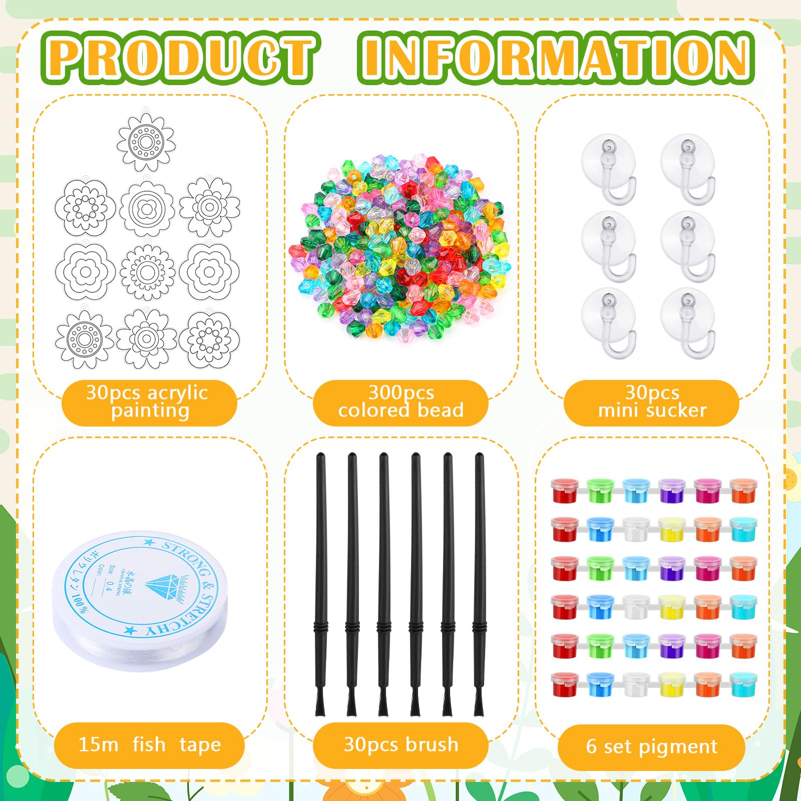 Features: Unleash your creativity with suncatchers window art kits, the comprehensive suncatcher craft kits provide hours of imaginative fun and artistic exploration. Its an ideal activity for rainy days, weekends, or any time they want to express their artistic talents DIY sun catchers ornaments are ideal for family, birthday parties and other occasions, not only a good choice for individual creation, but also an ideal project for group activities. Specifications: Material: acrylic Size: suncatcher about 3.5 inches in length Package includes: 30 x Sun catchers 300 x Acrylic beads, 30 x suction hooks 1 Roll 590.55 inches of fishing line 30 x Paintbrushes (with enough paint) Notes: Warm reminder, to handle dried paint, add a small amount of cold water to the pigment and mix it well before use Manual measurement, please allow slight errors on size. The color may exist a slight difference due to different screen displays. Winding risk may exist, please keep our the fishing line away from children.