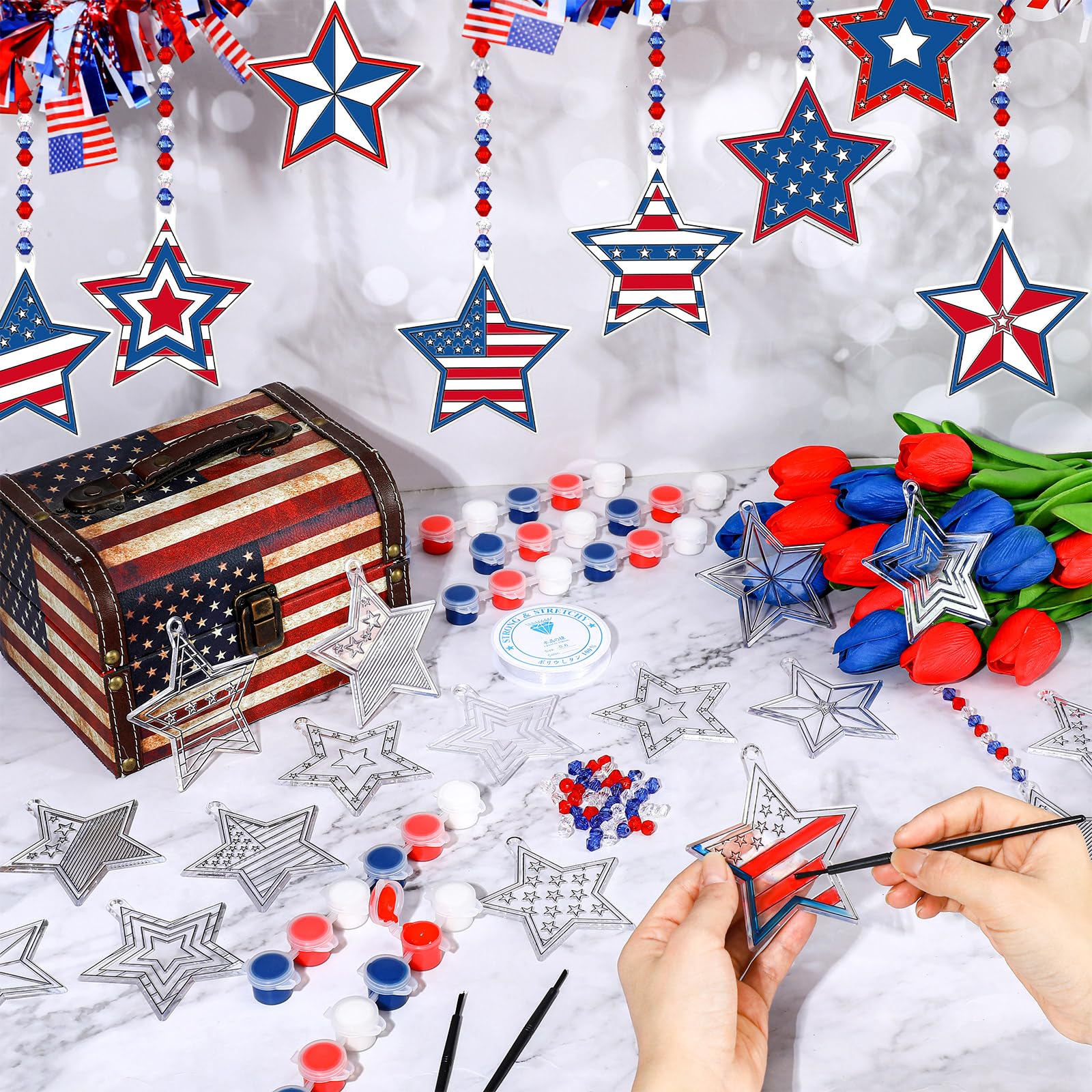 Features: Unleash your creativity with suncatchers window art kits, the comprehensive suncatcher craft kits provide hours of imaginative fun and artistic exploration. Its an ideal activity for rainy days, weekends, or any time they want to express their artistic talents DIY sun catchers ornaments are ideal for family, birthday parties and other occasions, not only a good choice for individual creation, but also an ideal project for group activities. Specifications: Material: acrylic Size: suncatcher about 3.5 inches in length Package includes: 30 x Sun catchers 300 x Acrylic beads, 30 x suction hooks 1 Roll 590.55 inches of fishing line 30 x Paintbrushes (with enough paint) Notes: Warm reminder, to handle dried paint, add a small amount of cold water to the pigment and mix it well before use Manual measurement, please allow slight errors on size. The color may exist a slight difference due to different screen displays. Winding risk may exist, please keep our the fishing line away from children.