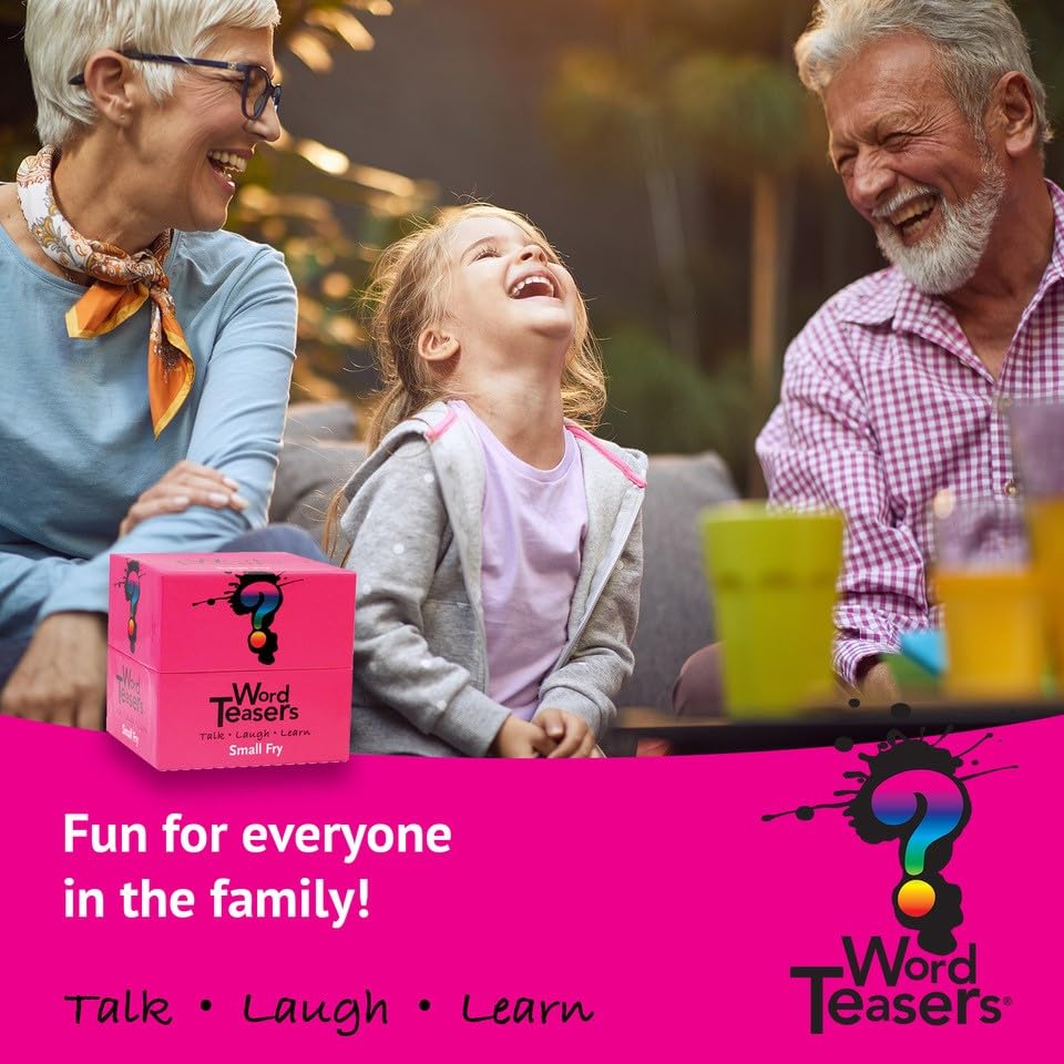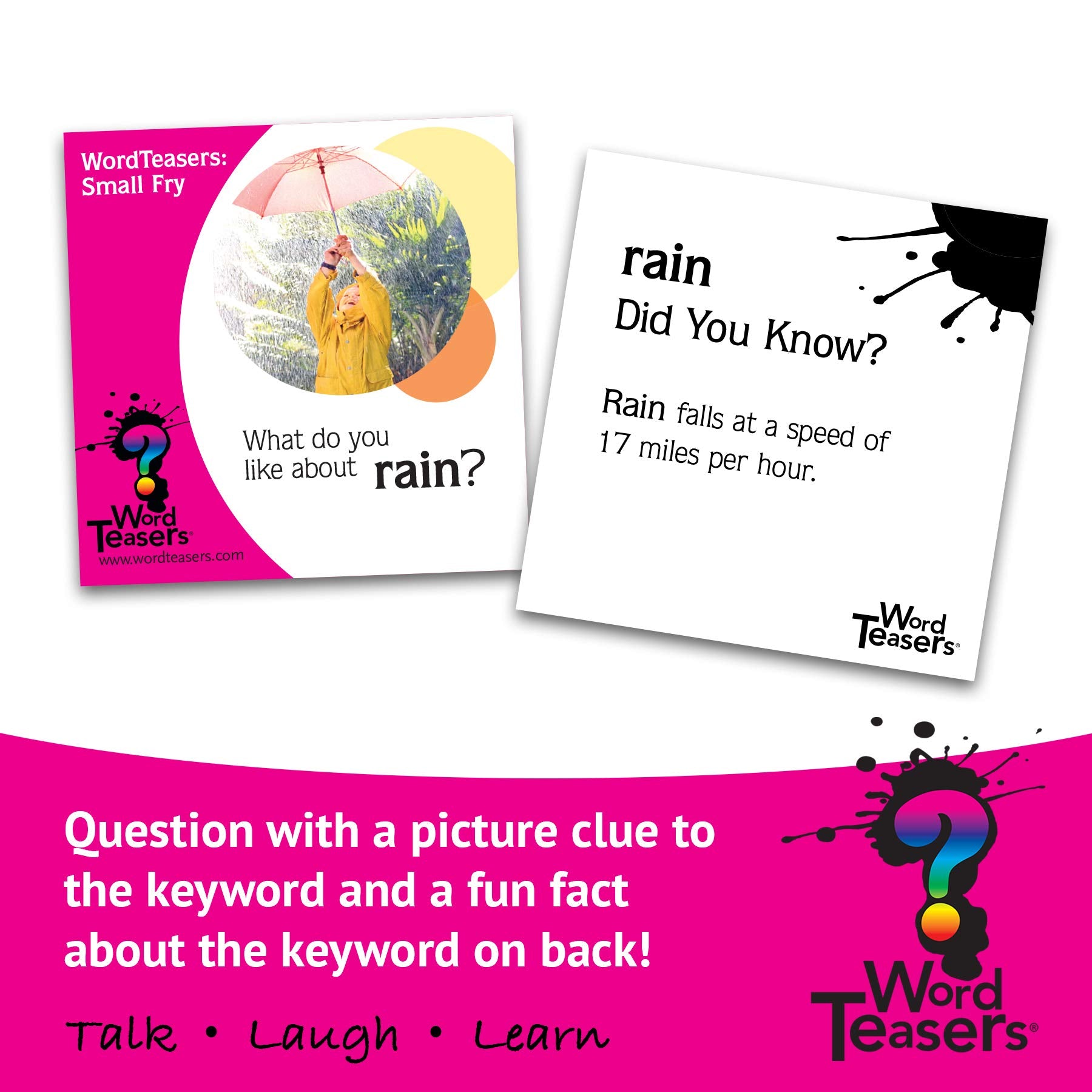 Word Teasers - Small Frymake Learning Easy And Fun With The Small Fry Conversation Starters! This Box Features Lively Questions With A Vocabulary Word That Kids Should Know By The Time They Enter Second Grade And A Picture That Is A Clue To The Word. The Back Of The Card Has A Fun Fact About That Featured Word.Example Conversation Starterfront Of Cardwhat Do You Like About Rain?Back Of Carddid You Know? Rain Falls At A Speed Of 17 Miles Per Hour?Put The Phone Down And Have Fun With Your Family!Kids Can Get To Know Their Friends And Family Better While Learning Key Vocabulary Words. This Fun Card Game Is A Great Way For Kids To Build Their Vocabulary And Use New Words In Conversations.Ages 4+