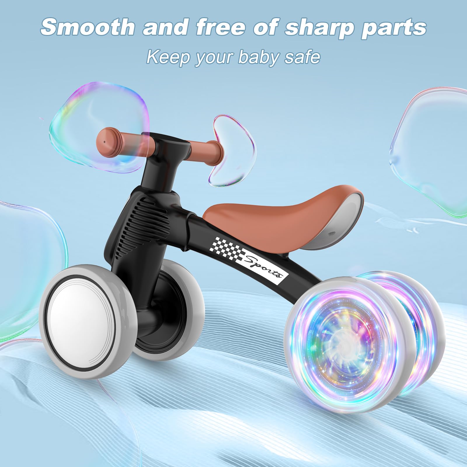 ?COLORFUL LIGHTING DESIGN? To enhance childrens fun, we have specially designed the colorful lighting rear wheel. No batteries are required, just spin the wheels to glow. Greatly increases the fun for children. | ?THE BEST PARTNER FOR KIDS? Recommended ages for 10-36 months. baby balance bike can bring fun and joy to children. Its a Great gift for toddlers to learn to walk and ride. Can help enhance the babys balance, steering, coordination, and increase self-confidence. | ?SAFELY RIDE? No pedal and fully widened closed wheel to avoid clamping babys feet. 135