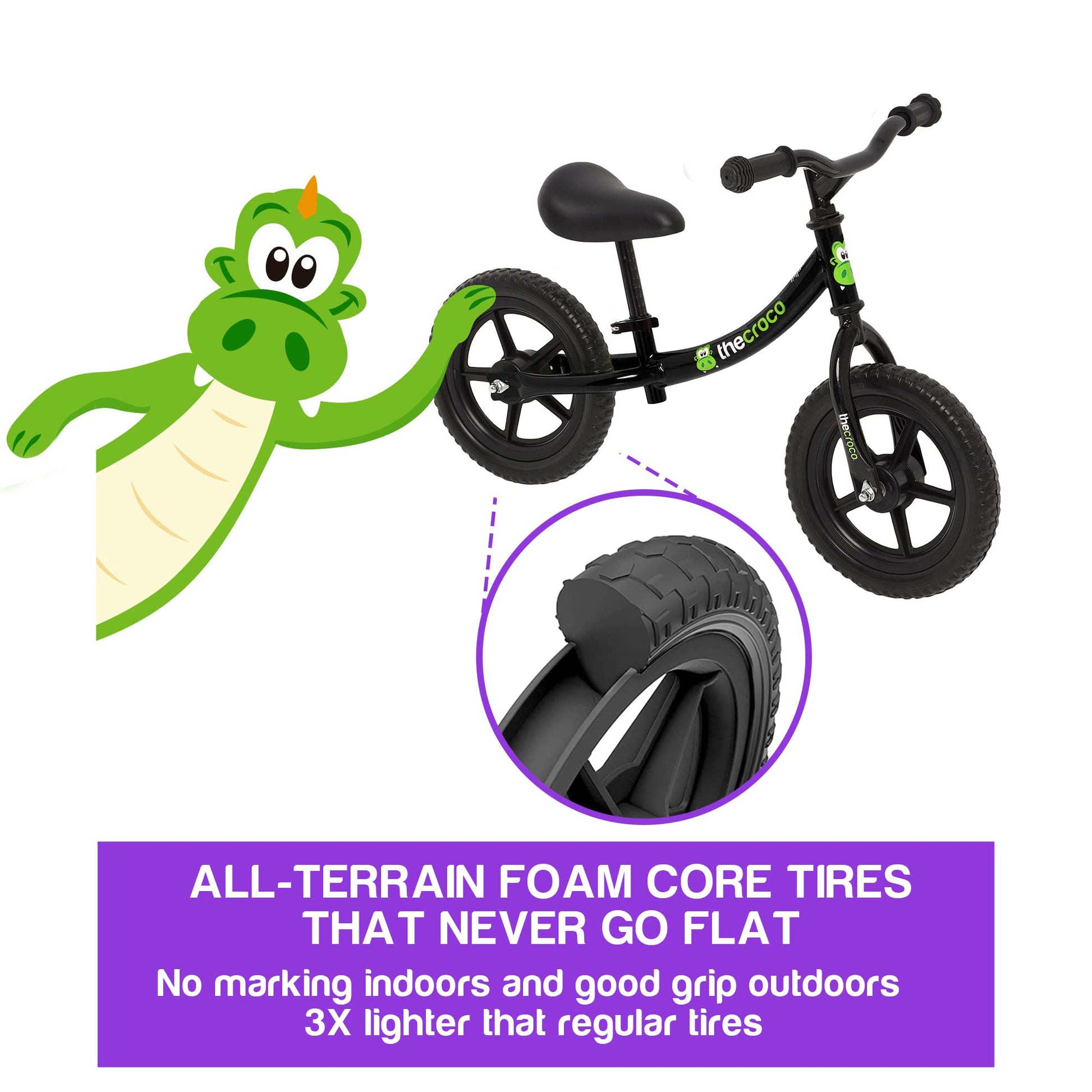 • Q: What makes the tires of this balance bike unique? A: The Croco Balance Bike uses no-puncture ultralight foam tires that are five times lighter than regular rubber tires, providing a comfortable riding experience without the need for inflation.