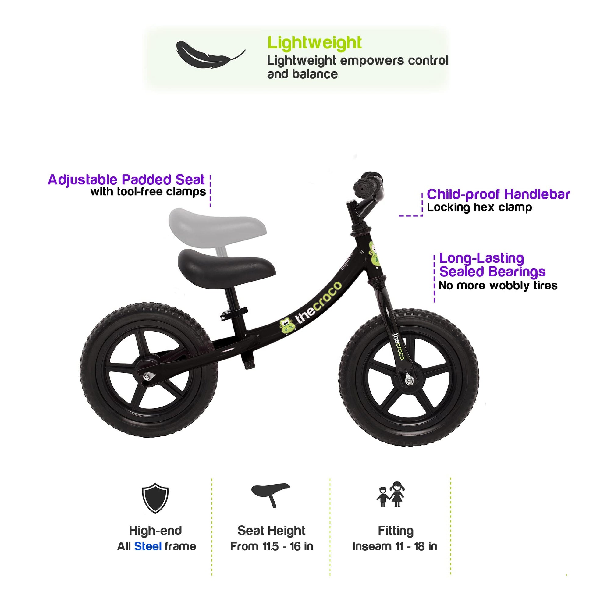 Thecroco Balance Bike Is Specially Designed For Children To Focus On Balance While Developing Their Coordination And Confidence At A Very Early Stage. It Provides The Stability They Need, Minimizing The Danger Of Riding, Yet Being Light Enough For Any Child To Control It. Give Your Kids The Best Experience And Happiness That Lasts.
