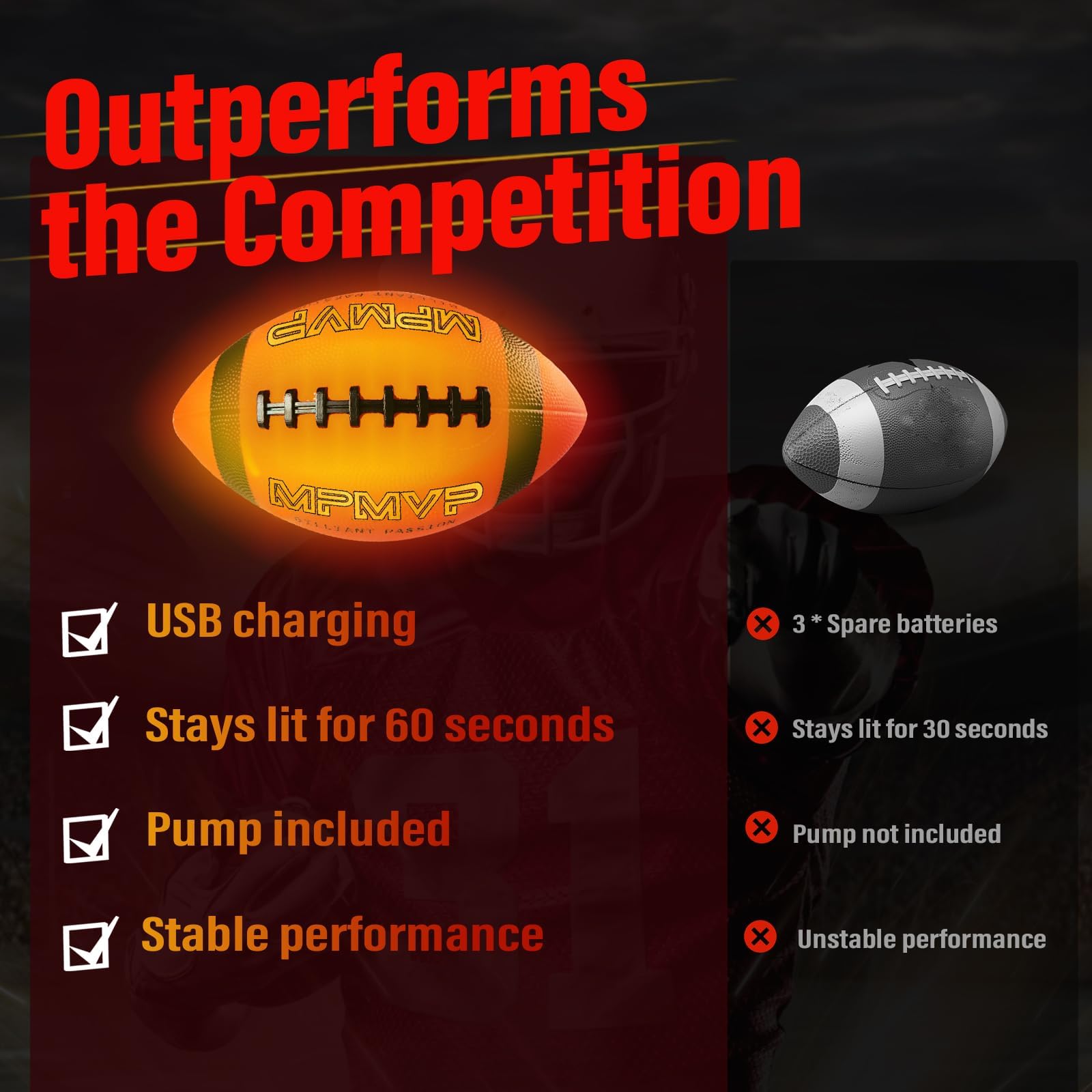 - Q: How does the LED lighting work in the Cadyaw football? A: The Cadyaw football features impact-activated LEDs that light up for at least 60 seconds once activated, ensuring maximum visibility during night games. The LEDs automatically shut off after the game to conserve battery.