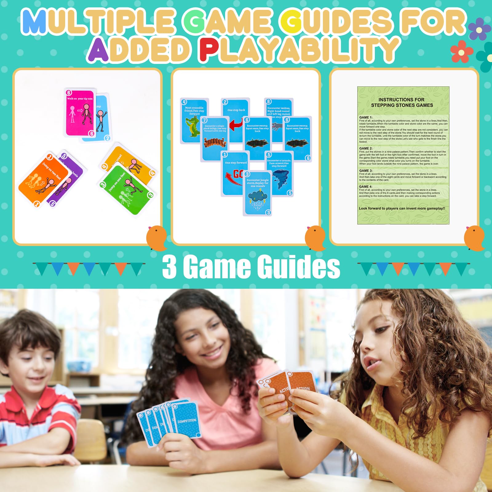 - Q: What does the set include and how can it be used? A: The set includes 5 lighted stepping stones, 2 sensory pods, 4 non-slip mats, game cards, a turntable, and a storage bag. These components allow for various configurations and games, encouraging imaginative play.