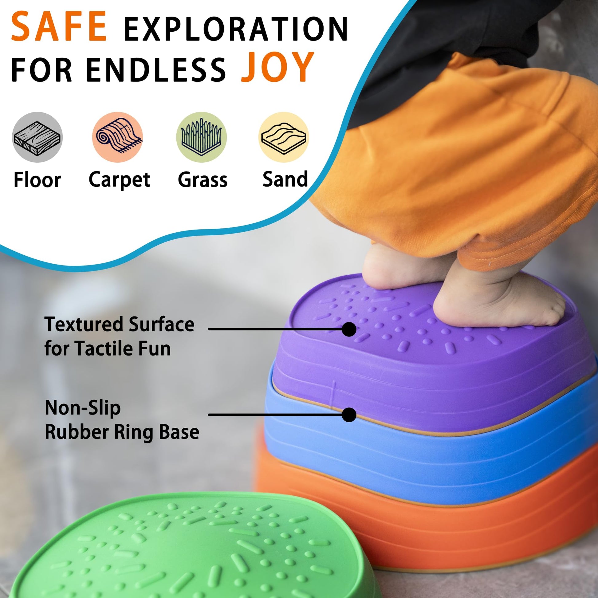 Elevate Your Child'S Playtime With Our 6 Pcs Set Of Stepping Stones, Perfect For Enhancing Balance And Coordination. These Bounce Blocks Kids Interactive Balancing Blocks Are Crafted From High-Quality, Non-Toxic Plastic, Each Featuring A Non-Slip Bottom For Safe Play. Ideal As Kids' Fitness Equipment And Outdoor Play Toys, These Vibrant And Engaging Stones Are Perfect For Active Play And Make Excellent Montessori Toys For 3-Year-Old Children. They Are Also Toddler Playroom Essentials, Adding Fun And Functionality To Any Play Space. Our Balance Stepping Stones, Which Kids Can Arrange In Multiple Configurations, Provide Endless Fun For Both Indoor And Outdoor Play. Designed As Outdoor Sensory Toys, These Stones Stimulate Sensory Development And Are Perfect For Sensory-Seeking Toys And Toddler Sensory Toys. They Are Excellent For Toddler Play, Offering Safe Exploration And Endless Joy. Lightweight And Portable, Our Plastic Stepping Stones Are Stackable For Easy Storage. These Textured Stepping Stones For Kids Can Be Taken To Parks, Playgrounds, Or Friends' Houses, Ensuring Continuous Fun Wherever You Go.