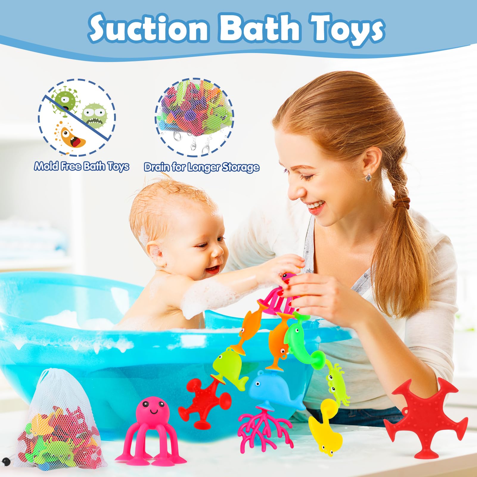 Baby Suction Cup Toys, 18 Pcs Silicone Ocean Animals Suckers With Mesh Bag Storage, No Hole Mold Free Bath Toys For Kids Ages 4-8, Sensory Window Travel Toys For Toddlers Boys Girls 3 4 5 6 Year Old