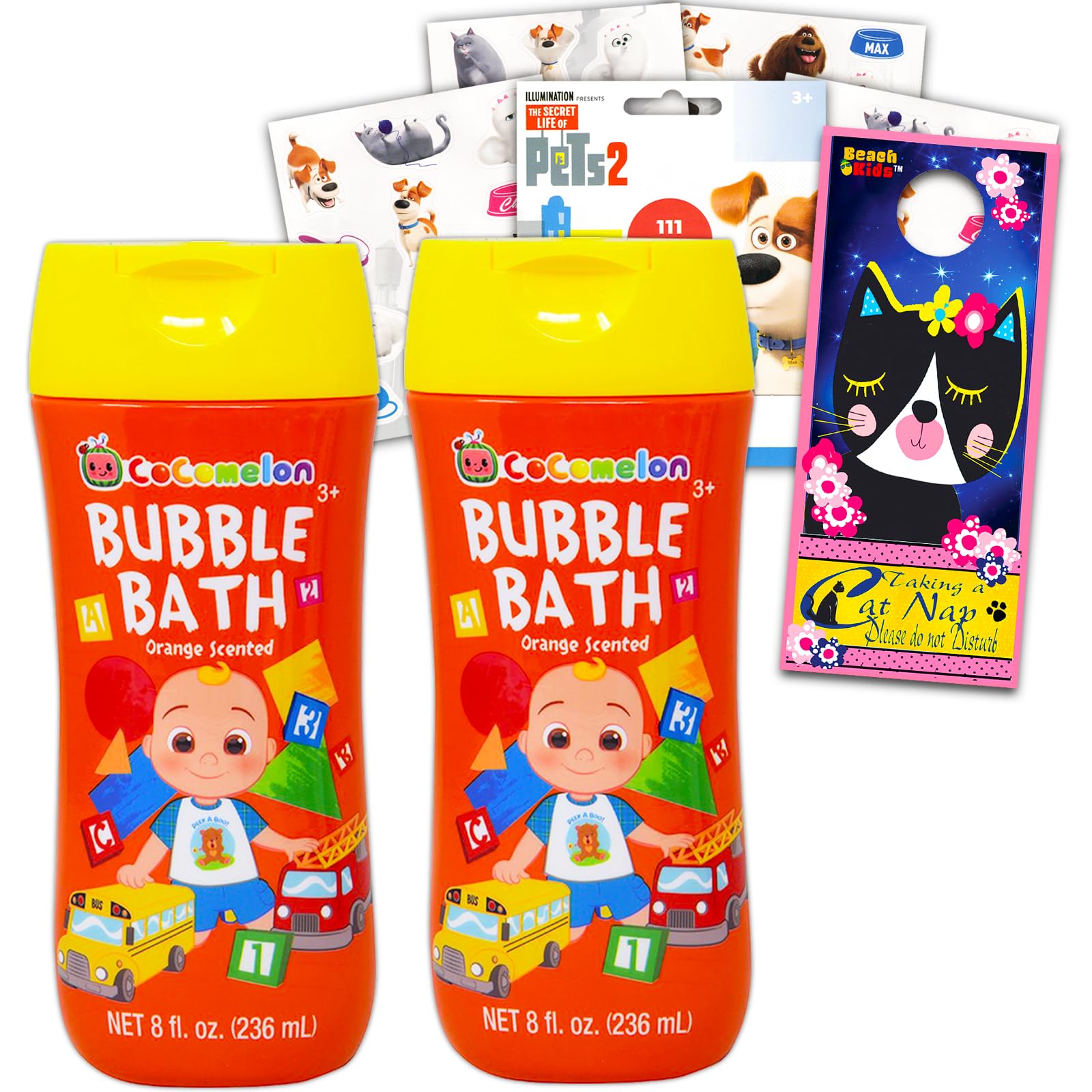 CoComelon Bathroom Set for Kids, Toddlers ~ 4 Pc CoComelon Accessories Bundle with Bubble Bath, Stickers and More (CoComelon Bath Supplies). This CoComelon bathroom set comes with 2 orange scented CoComelon bubble bath bottles (8oz each). Perfect for any fan of the show, this complete CoComelon bathroom set will turn bath time into fun time for toddlers and kids of all ages, boys and girls alike. The CoComelon bubble bath pack also comes with Secret Life of Pets stickers. Great as party favors, party supplies, goodie bag stuffers and more. Officially licensed CoComelon bathroom set. The CoComelon bubble bath pack also comes with a bonus Beach Kids cat door hanger!