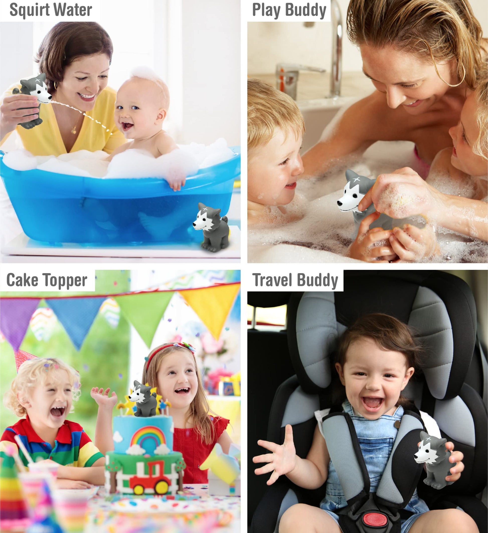 Entertain your little one with cute tub animal toys that will make them want to take a bath every single day. DolliBu Wolf Squirter Bath Toy is part of our cool wild life collection of bath buddies & makes any water activity a joyous one. Ideally suited for the bath, pool, or the beach. Designed with lively colors & crafted with a perfect size for little hands to hold & squeeze. Cute animal bathtub toys or bathing toys are great for educating little children & expanding their knowledge about animals & colors. Perfectly sized baby tub toy that can be played within the bathtub or in the pool for endless fun, & can also be played outdoors for imaginative pretend play. Use as toy decor for an animal-themed room! Wolf -shaped baby water floaties also make cute gifts for little kids. Make your kids look forward to bathtime! Bath squirties are perfect floating toys for kids who enjoy spending time in the water. A fun toy to play & share with siblings & friends in a tub , pool or sandy beach. Perfect for parents who want to make bath time a fun & educational learning experience for their children. Ideal baby shower gift for expecting mothers or a party favors. Includes 1 Wolf Bath Buddy Squirter Toy for kids. The wild life bath toy features smooth, soft, & rounded edges to ensure the safety of children while enjoying fun water games. Designed with cute cartoon eyes & soft rubber ears and tail. The adorable wolf shoots out water from a tiny hole when squeezed. Wolf Bath Buddy Squirter is a floating bathtub or pool toy, made of premium quality rubber materials. The wolf toy is durable, lightweight & is colored with non-toxic materials, which makes it safer & easier for children to play in the shower or while enjoying a swim. Preserve this cute bath squirter toy by hand washing, sqeeze out all water, & letting it completely dry before the next use to prevent any build-up. Wolf baby float squirter toy measures around 3 inches, perfect fit for babies' little hands.