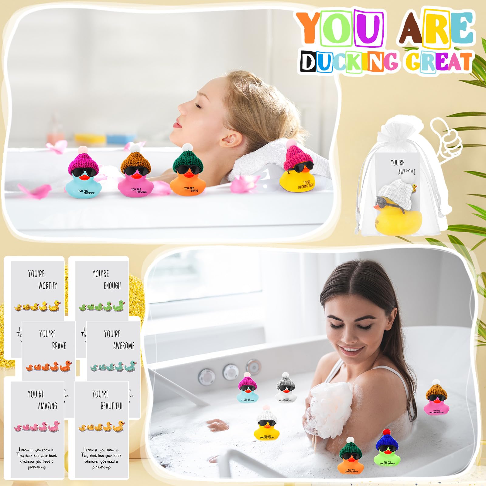Features: Light and portable: These rubber Ducks are not only lightweight but also portable, making them easy to carry and a nice travel companion. Whether you're heading to the beach or simply taking a bath, these coworker appreciation gifts fit ideally in most bags without adding extra bulk. Cute and cool: Our rubber ducks with glasses offer both cuteness and coolness in one package. Their distinctive eyewear adds a modern and stylish touch, making them not just ordinary bath favor, but trendy companions that you absolutely adore. Specifications: Main material: Rubber ducks: rubber Mini thank you cards: coated paper Organza bag: organza Color: as shown in pictures Size: as shown in pictures Package includes: 108 x Rubber ducks 108 x Mini black sunglasses 108 x Mini thank you cards 108 x Organza bag Notes: Manual measurement, please allow slight errors on size. The color may exist a slight difference due to different screen displays.