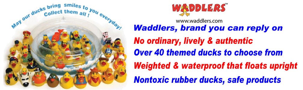 - Waddlers brand Nurse Rubber Duck, - authentic design of caring medical nurse expressed rubber duck, Always ready and cheerful nurse duck on 24-7-365 without ceasing, - happy squeker nurse duck, - color yellow, - size 3.5' L x 3' W x 3.5'H, - Product Safety: Meets and exceed CPSIA, EN71 & Cal Prop 65 Safety Regulations, free of all heavy metals and 7 Phthalates. - Originator, place and time: Steve S. H. Chen, Fremont, CA in 2001.