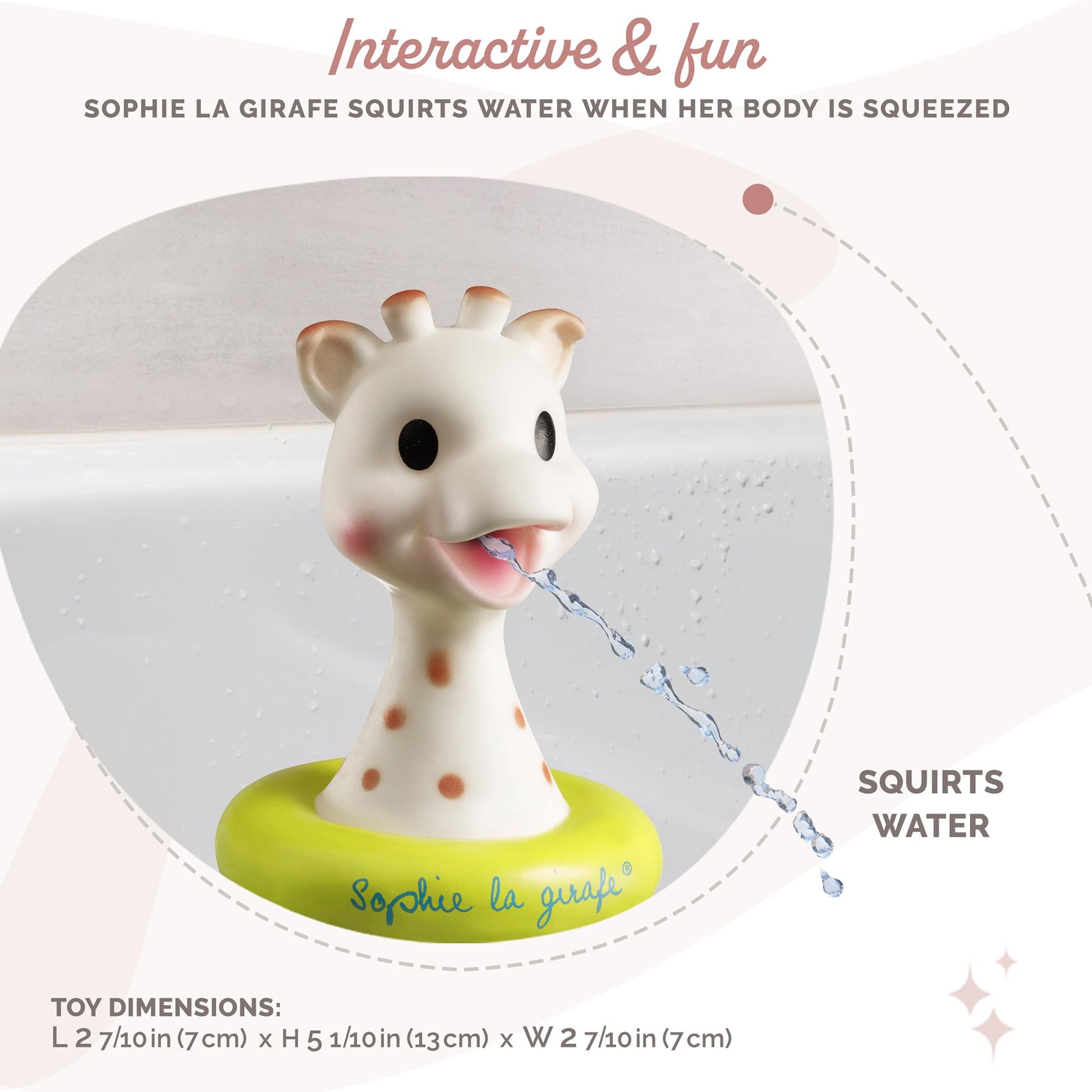 - Q: What makes Sophie la girafe Fresh Touch bath toy unique? A: The Sophie la girafe Fresh Touch bath toy is a fun spin on the classic Sophie toy, designed specifically for bath time. It features a playful design that allows it to float and spray water when pressed, making it a delightful companion for babies during bath time.