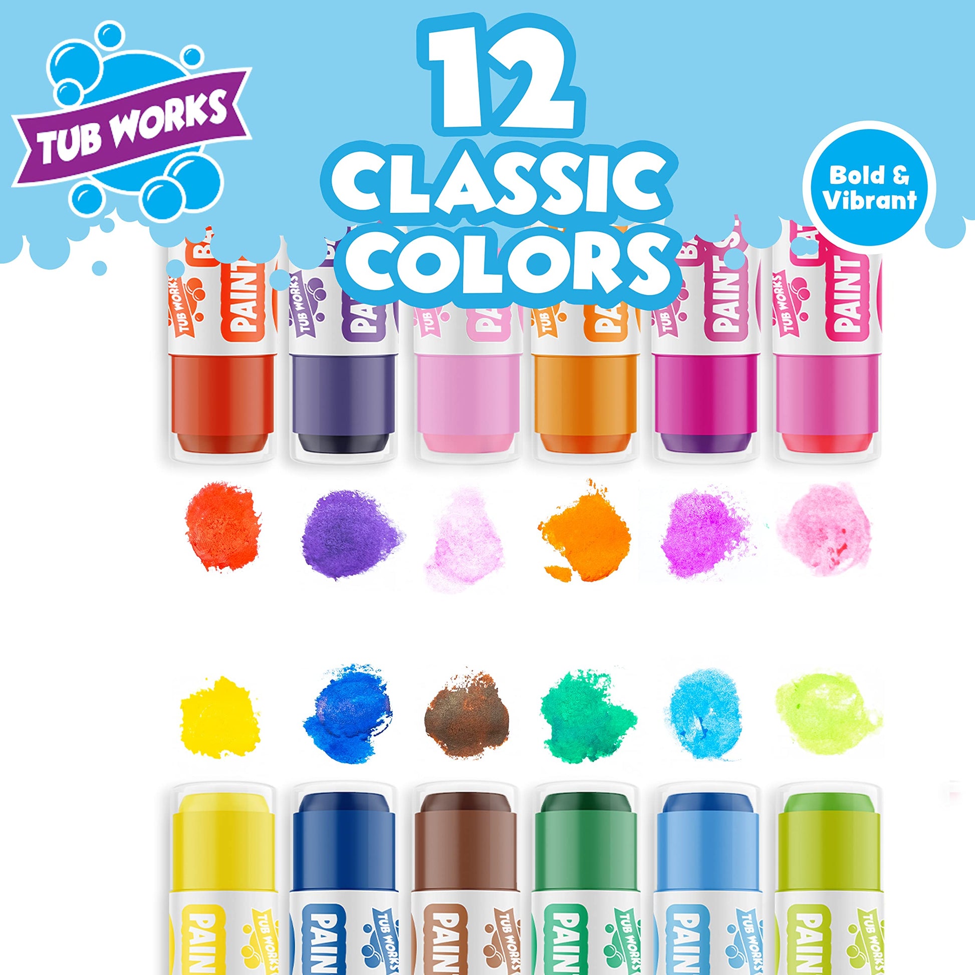 - Q: What colors are included in the Bath Paint Sticks set? A: The Tub Works Bath Paint Sticks set includes 12 vibrant colors: red, pink, orange, yellow, blue, light blue, purple, green, light green, brown, hot pink, and magenta, providing a wide range for your child's creativity.