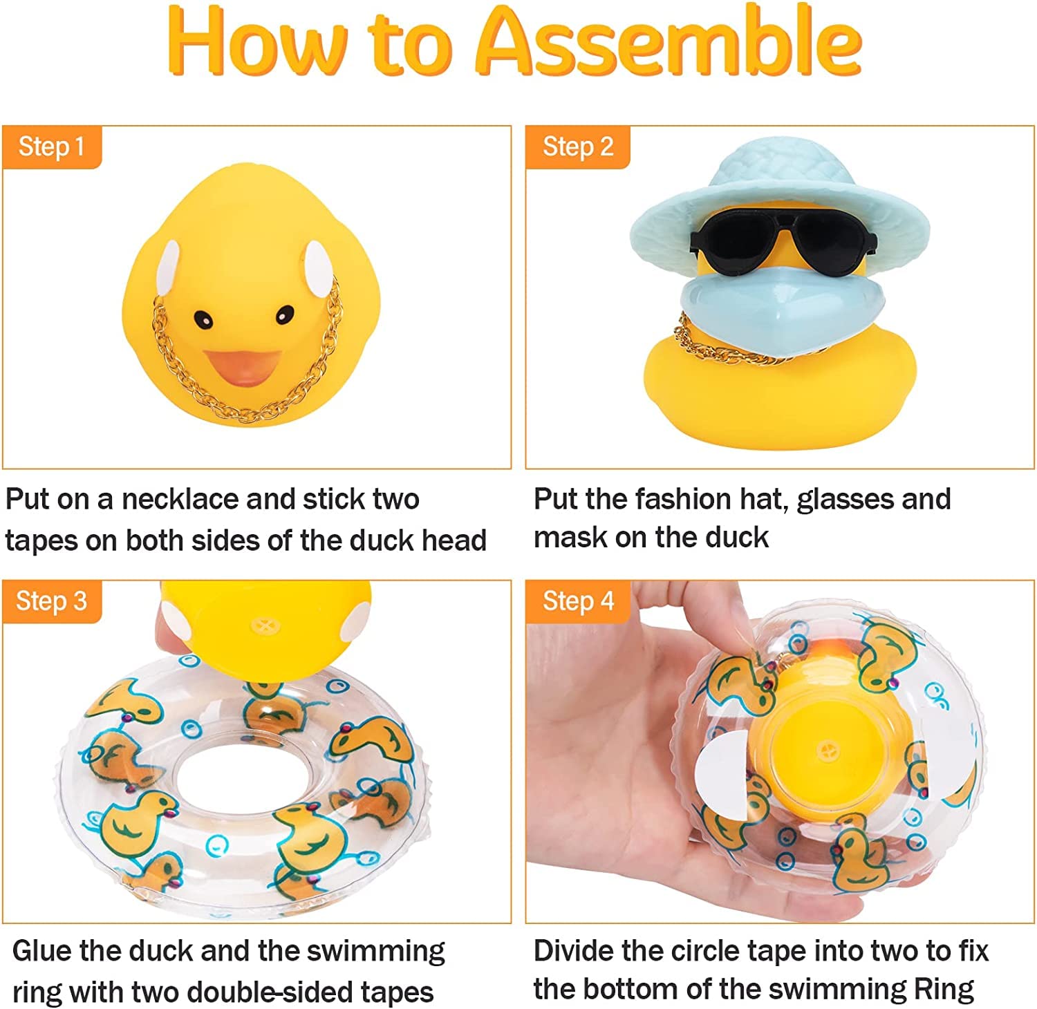 • Q: How do I assemble the wonuu Car Duck? A: To assemble the wonuu Car Duck, you need to put the necklace on the duck, fix the mini crown on its head using tape, attach the swimming ring to the bottom of the duck, and secure it with double-sided tape. A simple guide is included for easy assembly.