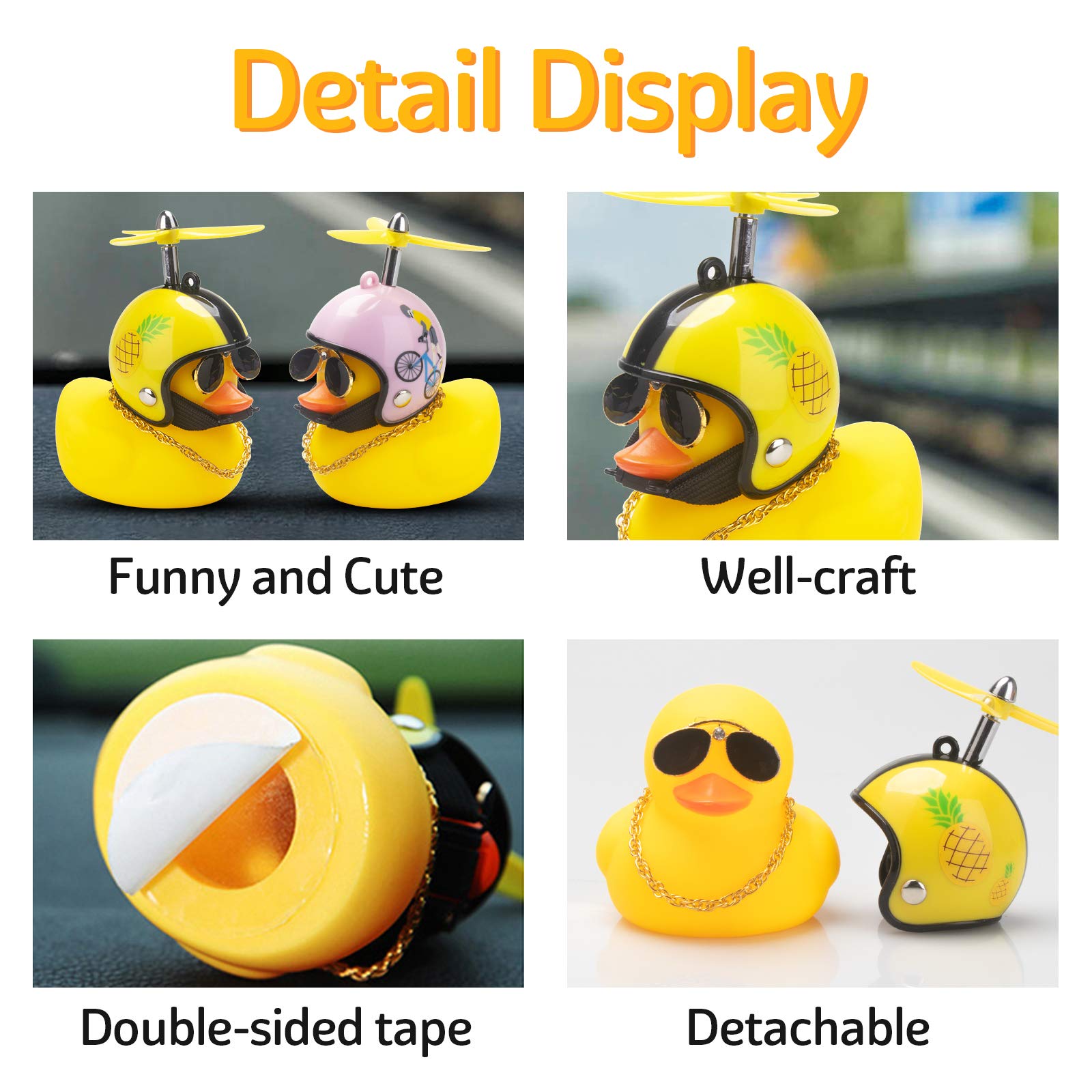 Funny&Adorable Duck - The Car Rubber Duck Will Make A Sound When Pressing, And The Three-Blade Propeller Will Spin Quickly When The Wind Blows, A Cool And Adorable Duck To Bring You More Happiness. | Cool Design - These Yellow Duck Car Ornaments Are Decorated With Cool Sunglasses, Necklaces, Helmets, Double-Sided Tapes And Other Accessories(As Shown In The Images), Very Interesting And Cool To Attract The Attention Of Others. | Wide Usage - These Rubber Yellow Ducks Are Suitable For Car Exterior, Dashboard, Window, Bookshelf, Desk, Living Room, Birthday Gifts, Christmas Gifts, And Can Be Used As A Fun Car Decoration To Relieve Fatigue And Add Fun To Your Driving Experience. | Safe Material - The Rubber Ducky For Car Is Made Of Safe Silicone, Smooth And Soft, Flexible And Lightweight, Not Easy To Get Destroyed. And Rubber Duck'S Soft Surface And Smooth Edges Allow You To Safely Grasp The Lovely Duck. | Diy Duck - Put The Necklace On The Duck, Install The Propeller On The Helmet With A Screw, Put The Helmet On The Duck'S Head, Then Stick The Glasses On The Duck With Double-Sided Tape, And Finally Stick The Duck Where You Want To Stick.