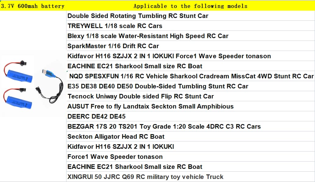 - Q: What types of RC vehicles are compatible with the 3.7V 600mAh Li-ion rechargeable battery? A: The 3.7V 600mAh Li-ion rechargeable battery is compatible with a variety of RC vehicles, including double-sided rotating tumbling stunt cars, RC high-speed racing cars, and specific models such as TREYWELL 1/18 scale RC Cars, Blexy 1/18 scale water-resistant high-speed RC cars, and others.