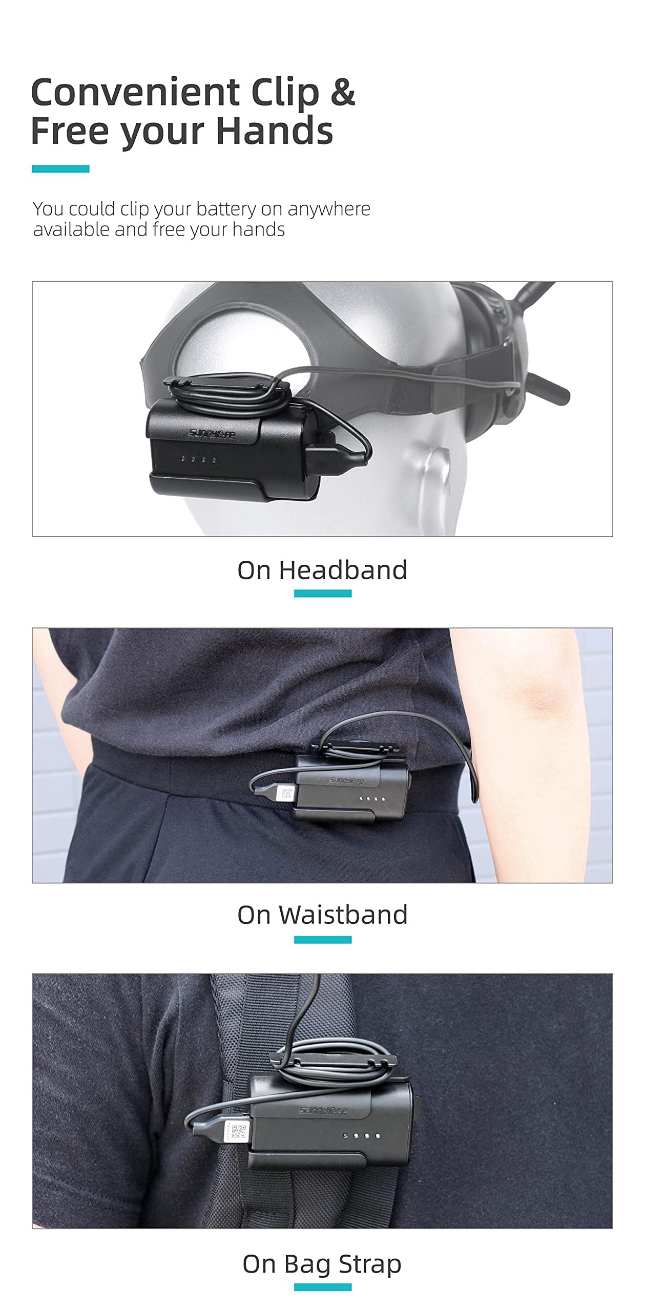 FPV Goggles Battery Specifications: Capacity: 1800 mAh Voltage: 9 V (Max.) Type: LiPo 2S Energy: 18 Wh Charging Temperature: 0 to 45 C Max Charging Power: 10 W Battery Life: Approx. 110 minutes (measured in an environment of 25C at maximum brightness level) Compatibility: FPV Goggles V2/FPV Goggles Tips:FPV Goggles Battery can only charge FPV Goggles V2. Please do not charge other devices. Battery Clip Specifications: Material:Plastic Packing size:85*61*38mm Net weight:22g Gross weight:31g Applicable models:FPV Intelligent Flight Battery In The Box: FPV Goggles Battery 1 FPV Goggles Power Cable (USB-C) 1 FPV Goggles V2 Battery Back Clip 1