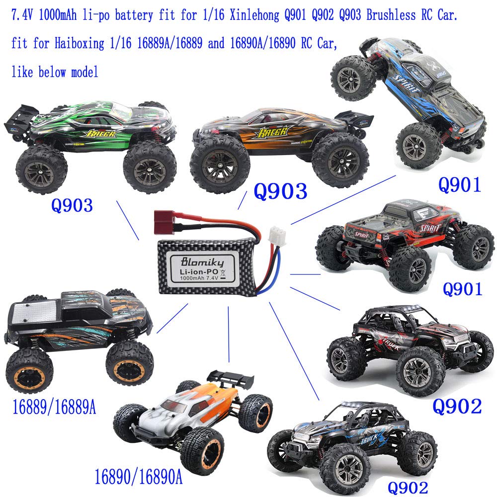 - Q: Can I use the Blomiky battery for other RC models not listed in the description? A: While the Blomiky 7.4V 1000mAh Lipo battery is specifically designed for certain models, it may also be compatible with other RC vehicles that use a similar battery specification (7.4V 1000mAh with a T connector). Always check your vehicle's requirements before use.
