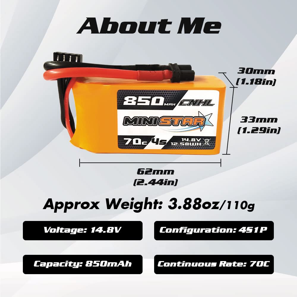 Brand: CNHL Minimum Capacity: 850mAh Configuration: 4S1P / 14.8V / 4 cells Discharge Rate: 70C Max Burst discharge Rate: 140C Net Weight(2g): 110g Dimensions: 33mm x 30mm x 62mm Connector Type: XT30U Balancer Connector Type: JST Package: 1x 850mAh CNHL battery