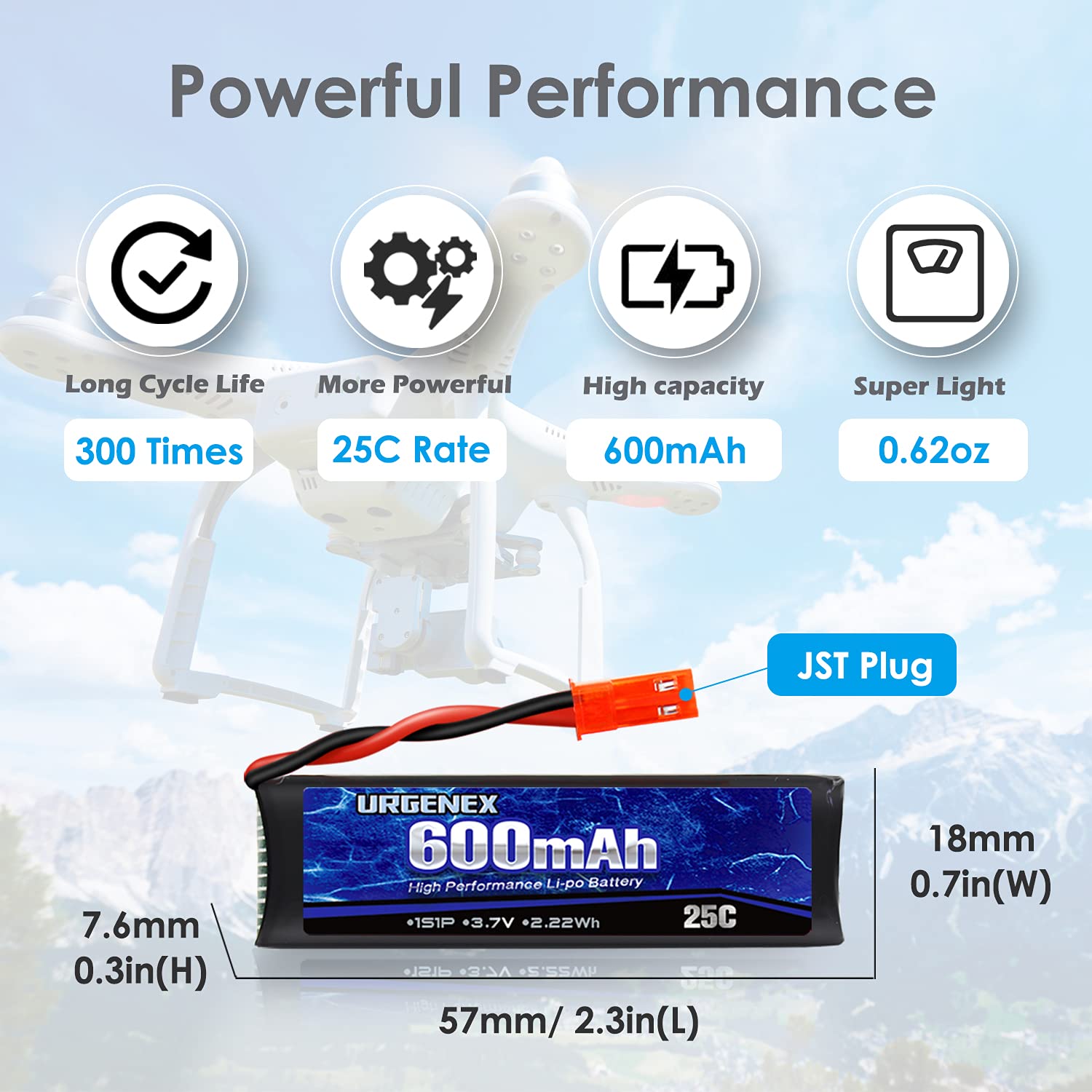 Specifications: Brand: URGENEX Chemistry: Li-Polymer Voltage: 3.7V Discharge: 25C Capacity: 600mAh Battery Plug: JST Battery Dimension: 57*18*7.6mm/ 2.3*0.7*0.3inch; Battery Weight: 18g/0.62oz(per unit) Application: Compatible for UDI U817 U817A U818A V959 V222 V929 RC Drone Quadcopter(Only if the voltage, dimension and the plug match, then it will fit).