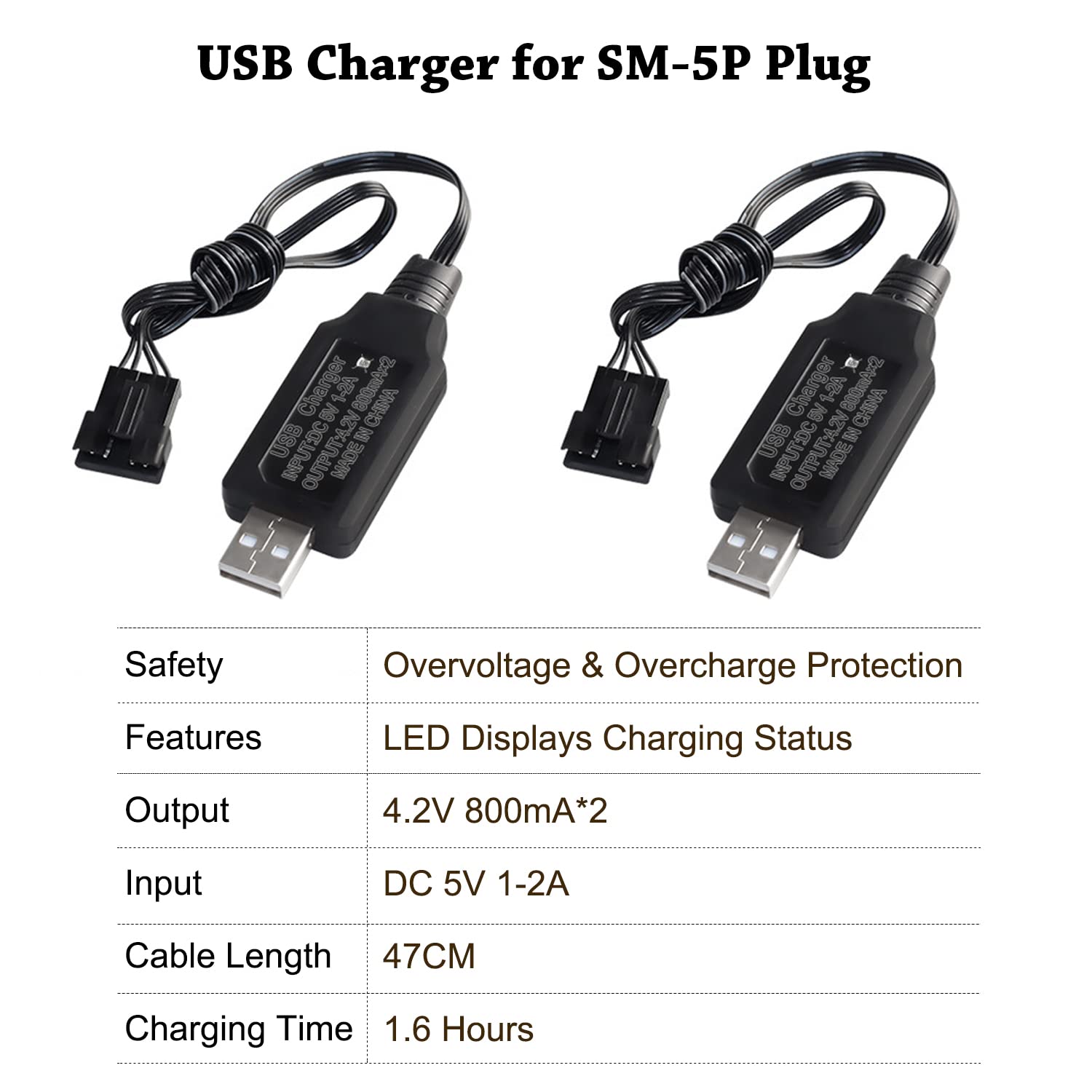 Specifications: Dimensions: 2.12*1.45*0.74inch; Weight: 74g/2.6oz Plug: SM5P Capacity: 1200mAh Volt: 7.4V Compatible with: R208&R308 RC Boats(Only if the voltage, dimension and the plug match, then it will fit). Package Included: 2 x VICMILE 1200mAh Batteries 2 x 7.4V USB Battery Charger
